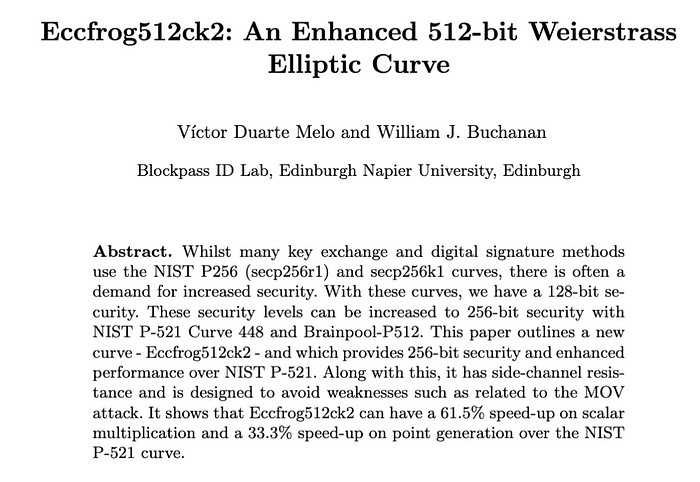 通过与 Víctor Duarte Melo 合作,我们开发了一种增强的椭圆曲线,该曲线提高了 P521 的性能,并命名为 eccfrog512ck2。 它已在 IACR [这里] 中发布: