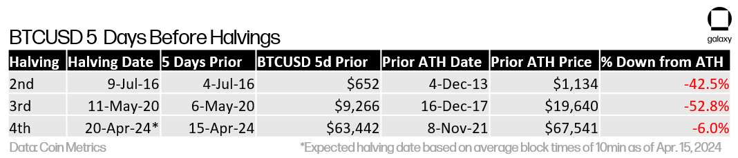 有史以来第一次,比特币价格在减半前已高于其先前的历史高点。在 2016 年和 2020 年的先前两次比特币减半期间,比特币价格分别从其先前的历史高点下跌了 42.5% 和 52.8%。虽然比特币在减半前强劲的价格走势可能被视为市场抢先炒作我们通常在减半后看到的炒作阶段,但推动本周期比特币价格的力量是在先前减半周期中不存在的新发展——特别是在 2023 年 1 月在美国推出基于现货的比特币 ETF。
