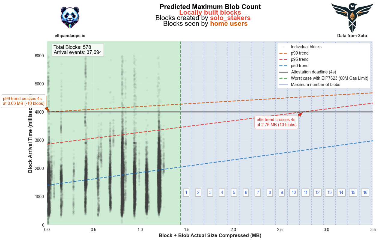我们观察到我们的家庭用户已经能够支持增加的 blob 数量,只有少数异常值超出 4 秒的阈值。我们还可以运行与锁定 6/9 相同的分析,以了解今天预测的最大 blob 数量是多少: