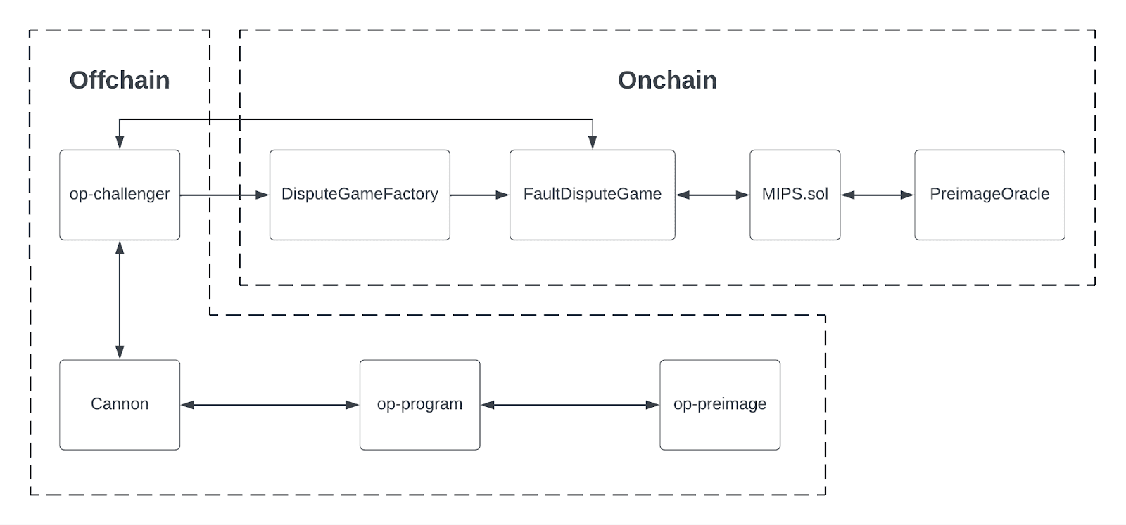 在上图中,该图是从 Clabby 的 故障证明演练视频 中重新创建的,我们可以看到 Cannon 与 OP-Challenger 和 OP-Program 交互。 OP-Challenger 是处理发起挑战和与争端游戏交互的组件,OP-Program 处理从 L1 输入派生 L2 输出。 但是,该图简化了 OP-Challenger、Cannon 和 OP-Program 之间的交互。