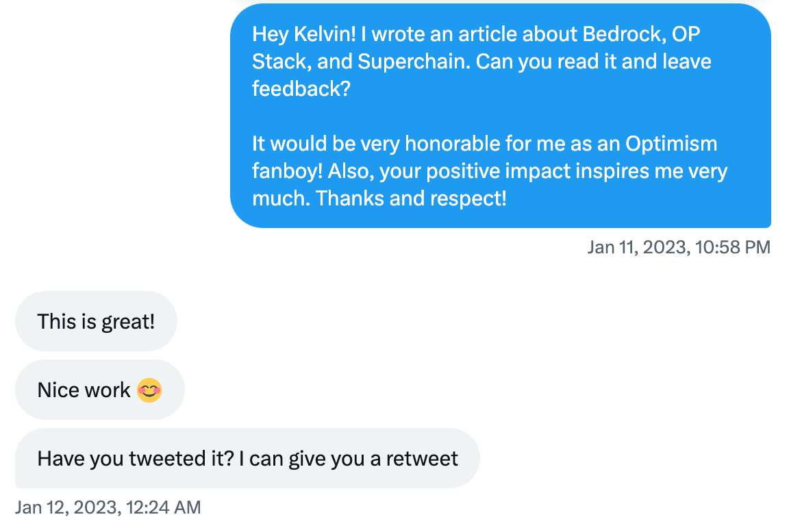在我们发布了 博客 后,我们偷偷给臭名昭著的 Kelvin Fichter 发了私信,问他是否可以审查一下。即使那是我们第一次和他对话,他也很友善,甚至转发了我们的帖子!在我们的私信对话中,我们问他:“我们如何成为另一个 OP Labs?我们应该从哪里开始贡献?” 他安排了一个电话,所以我们很高兴地加入了。