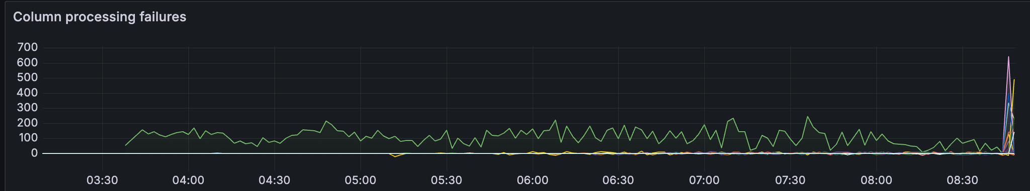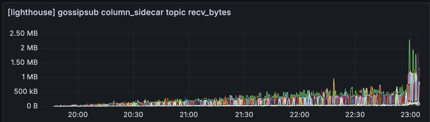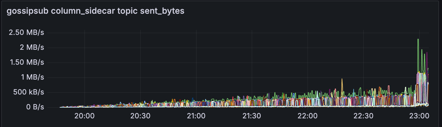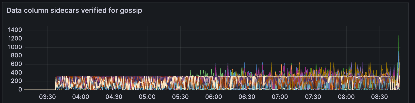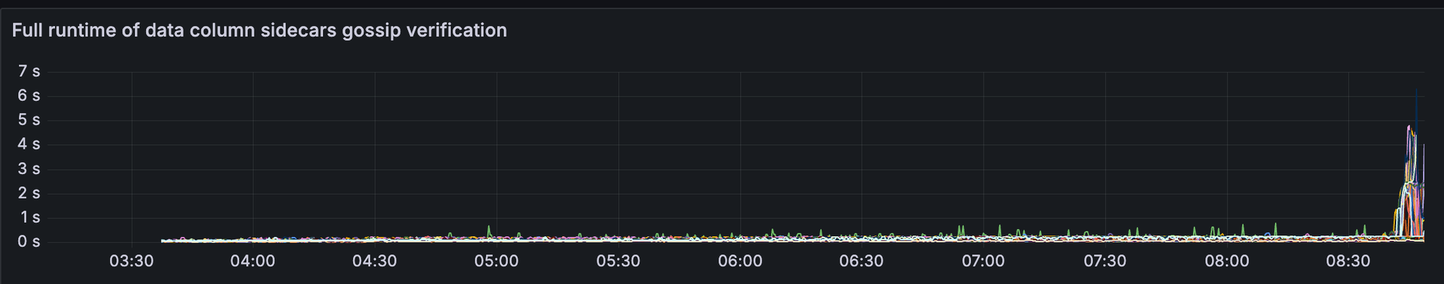 但是,实际通过 gossip 验证的数据列 sidecar 的数量并没有以相同的比例增加。 我们可能需要调查为什么会有如此多的列处理失败以及为什么 gossip 验证的运行时间会增加。
