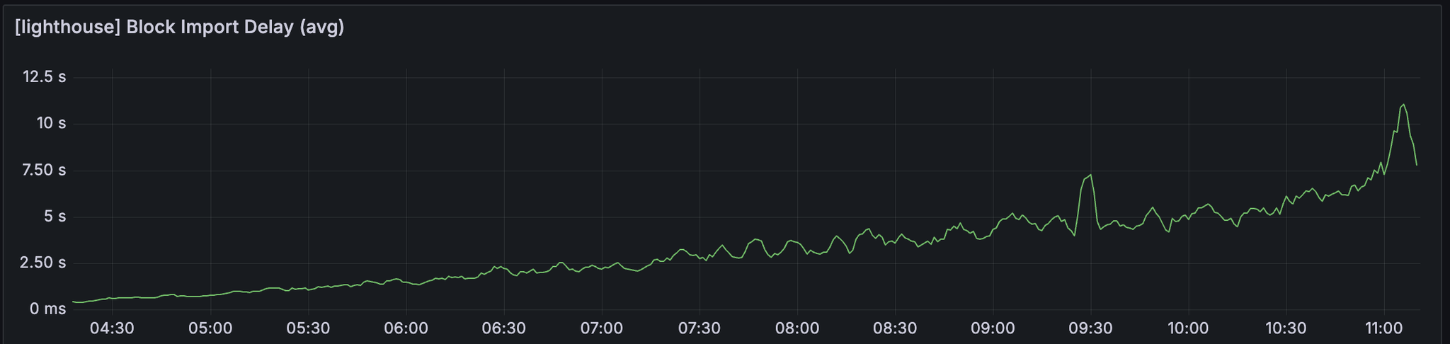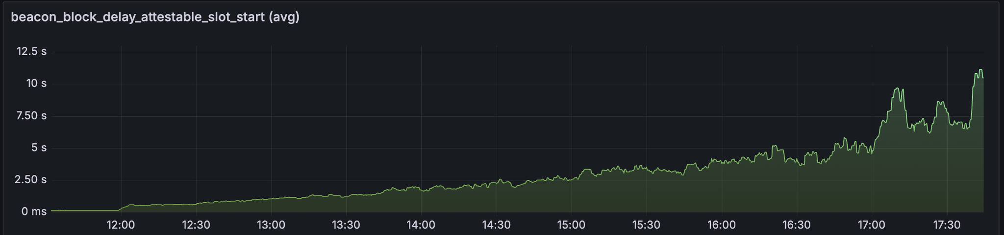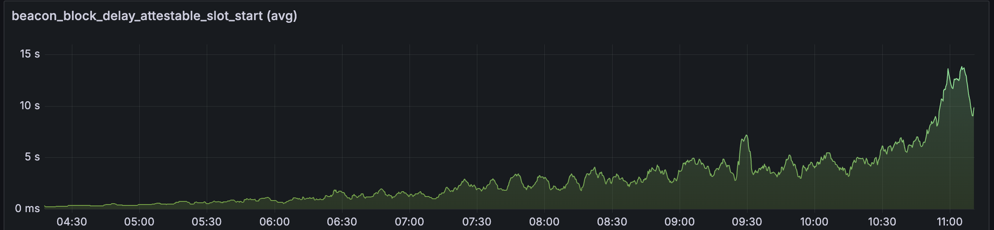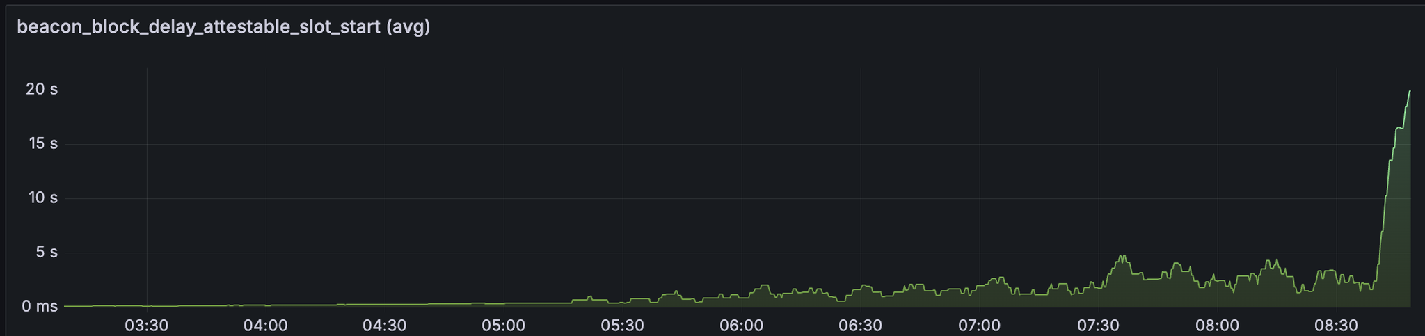 我们可以观察到区块导入延迟和 attestable_slot_start 时间持续增长,到网络变得不健康时超过 8 秒。