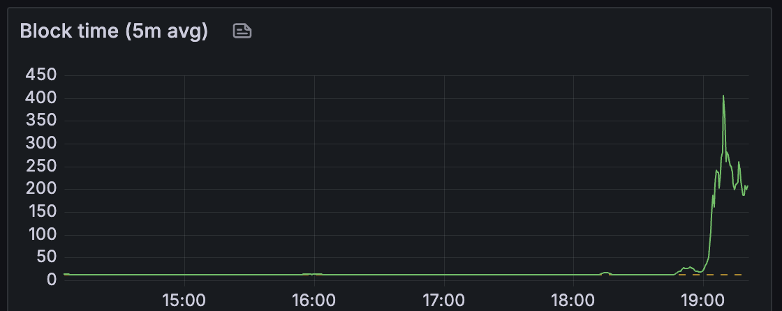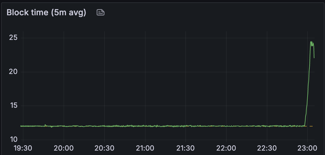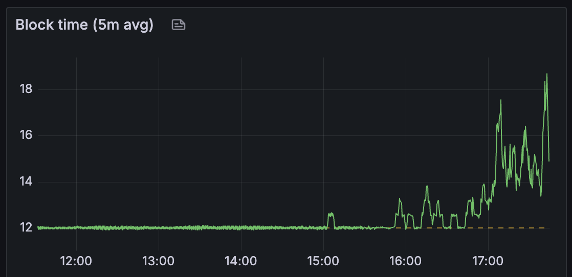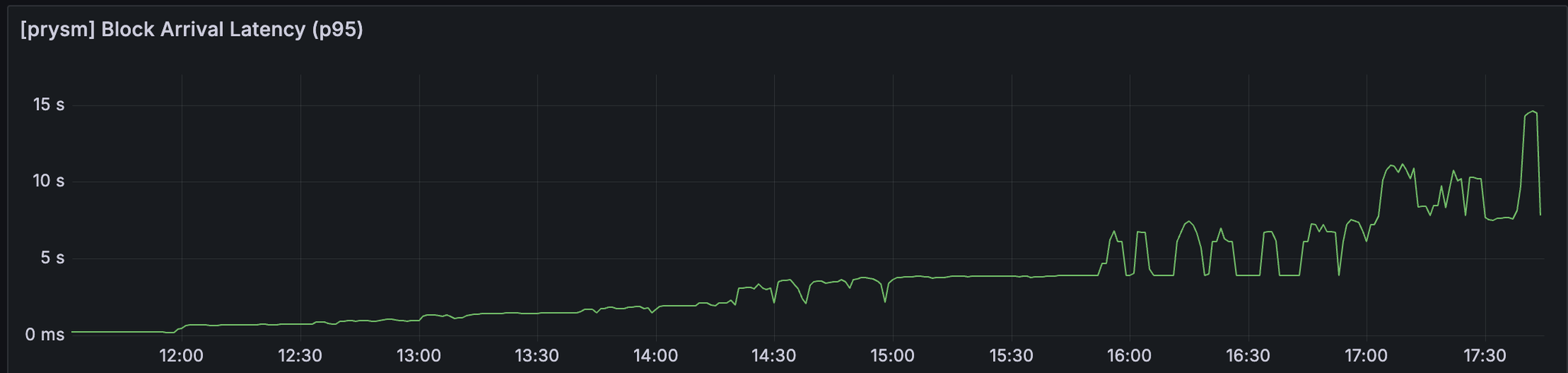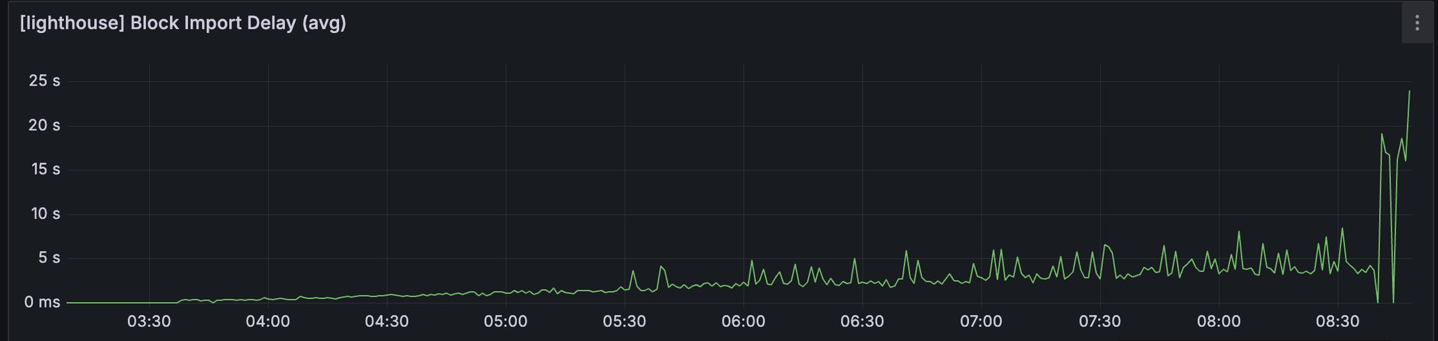 我们可以观察到区块导入延迟和 attestable_slot_start 时间持续增长,到网络变得不健康时超过 8 秒。
