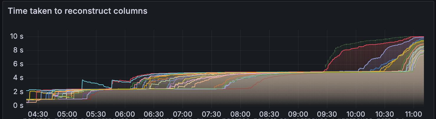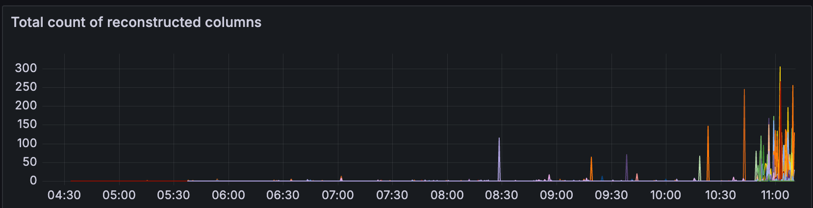 在同一时间戳附近,CL 开始重构更多列。 这可能是由于 EL 中缺少 blob,CL 必须 gossip & 重构单个列
