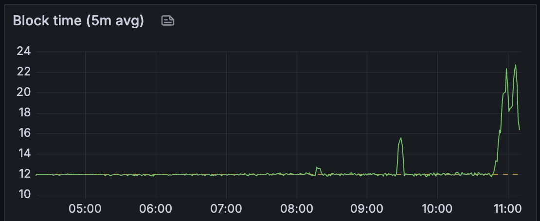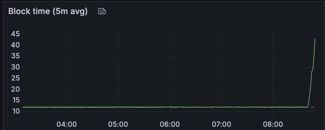 我们还看到区块导入延迟和 attestable_slot_start 时间保持稳定在 4 秒以下,直到网络在大约 08:40 变得不健康。