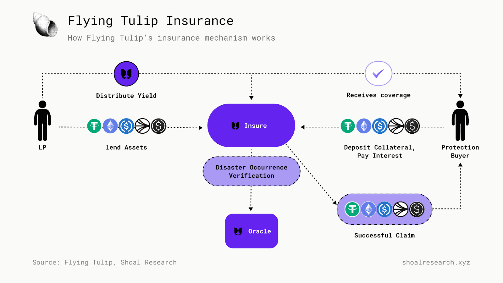 Flying Tulip 引入了一个协议原生保险层,为投资者链上保护,以防止前所未有的协议事件。这些事件包括智能合约漏洞利用、错误清算或协议交易、借贷和结算层中的其他技术故障。保险引擎作为覆盖买家(寻求保护其资本的投资者)和通过收取保费赚取收益的资本提供者之间的持续市场运作。