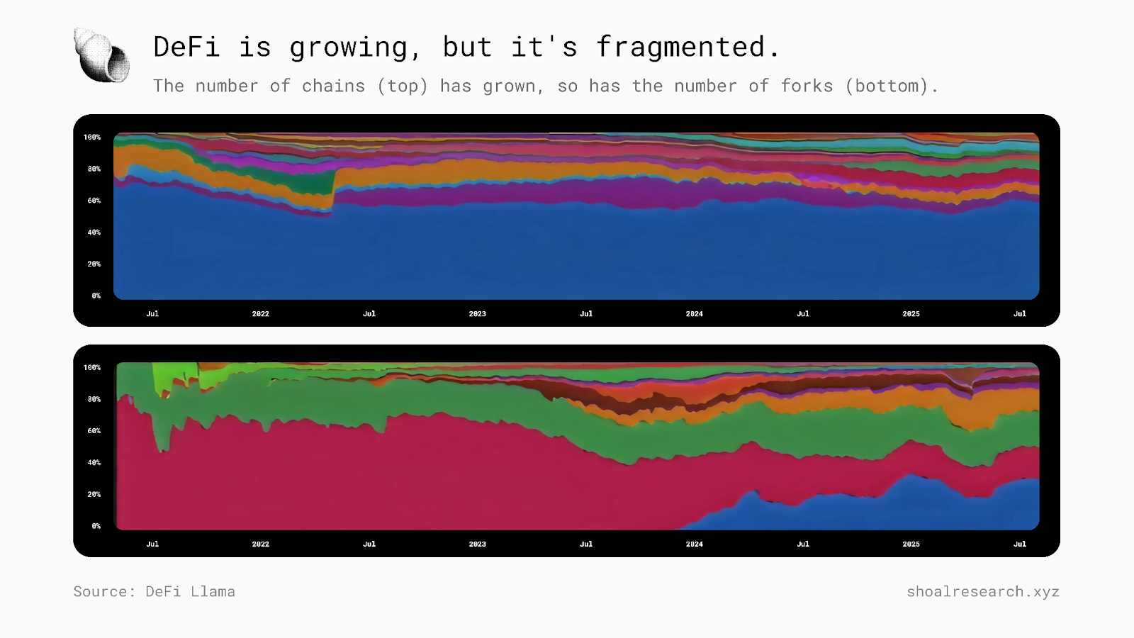 当然,可以认为 DeFi 面临着类似的命运。早期的互联网开始时是互不连接的网页和超链接的组合,而如今更广泛的 DeFi 格局也横跨数百条链、数万个协议和数百万个可交易资产,其中许多都是分叉。这种可复制性确实是一个特性,而不是一个错误。正如 Richard Stallman 所阐述的,自由复制、修改和共享代码的权利是真正自由软件的支柱。然而,在实践中,DeFi 的开源、无需许可的设计在推动创新的同时,也造成了大量的碎片化。