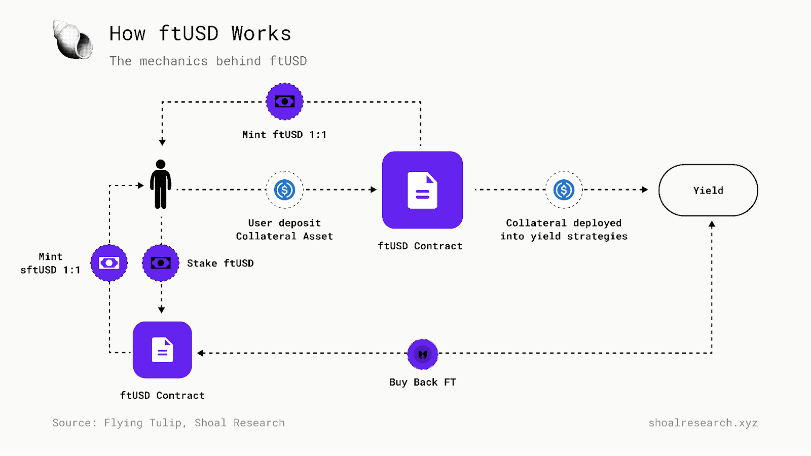 在扣除借款成本、费用和安全缓冲后实现的收益将按比例分配给持有的 sftUSD 数量。分配给 sftUSD 持有者的分配通过 sftUSD 和 ftUSD 之间的可变汇率反映出来。未质押的 ftUSD 不会产生收益;其收益将直接用于协议的资金库,以资助运营、扩大流动性并支持代币优先模型。