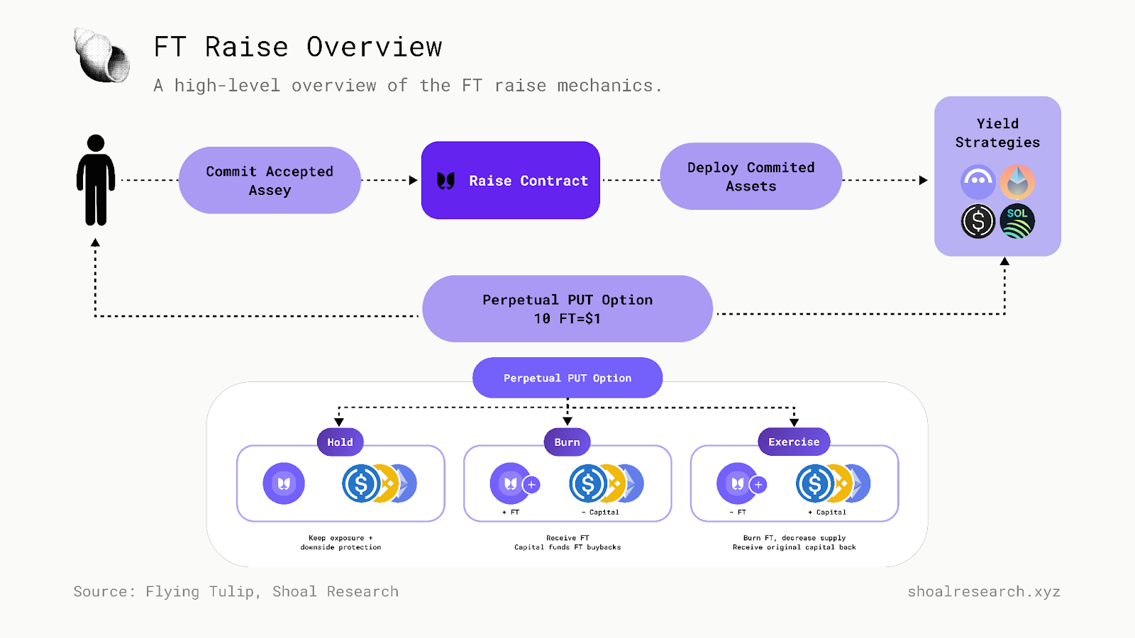 融资参与者将其 FT 头寸作为链上永续 PUT 接收。当期权处于活动状态时,持有者可以按面值以原始抵押资产赎回 FT,从而永久销毁赎回的代币;或提取 FT,使期权失效并释放支持资本以进行市场回购和销毁。