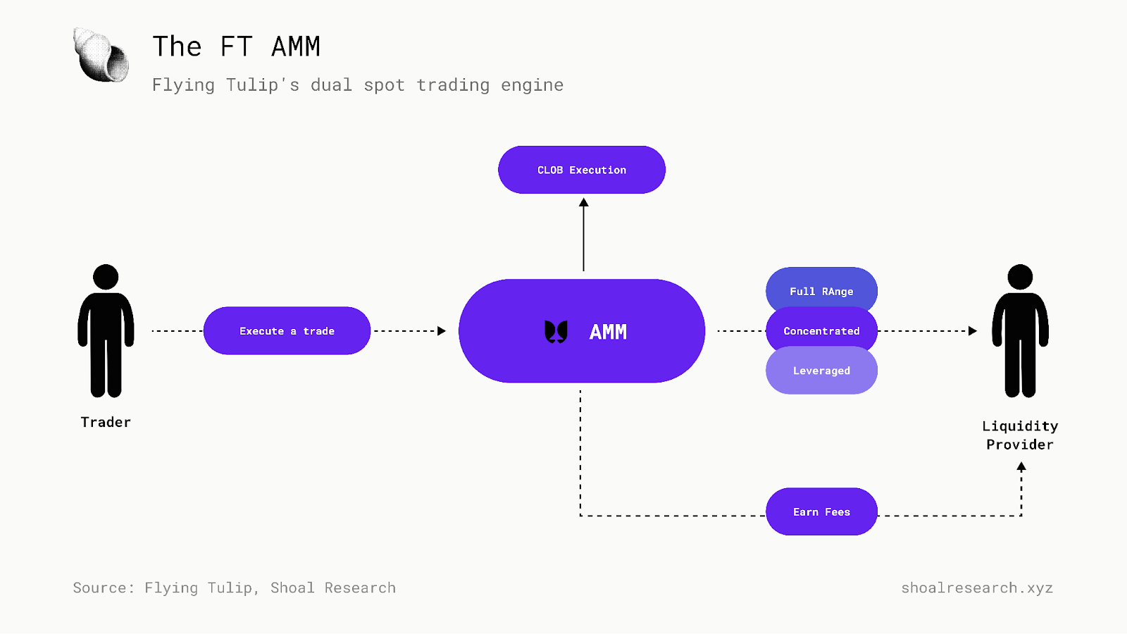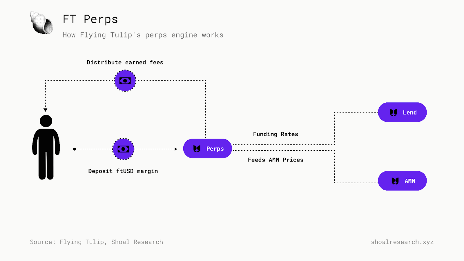 Flying Tulip 旨在在单个协议中捕获这两个目标。它连接了 DeFi 的核心 primitives:稳定币、交易、借贷、衍生品和保险,旨在通过统一的保证金账户动态地调整风险和定价与实时流动性和波动性。毫无疑问,如果 Flying Tulip 的启动和早期增长取得成功,将会有数十家模仿者构建和销售类似的产品。尽管如此,先发优势在 DeFi 中是一股不可忽视的力量。在 Shoal,我们相信 Flying Tulip 有望成为领先的实时 DeFi 栈。