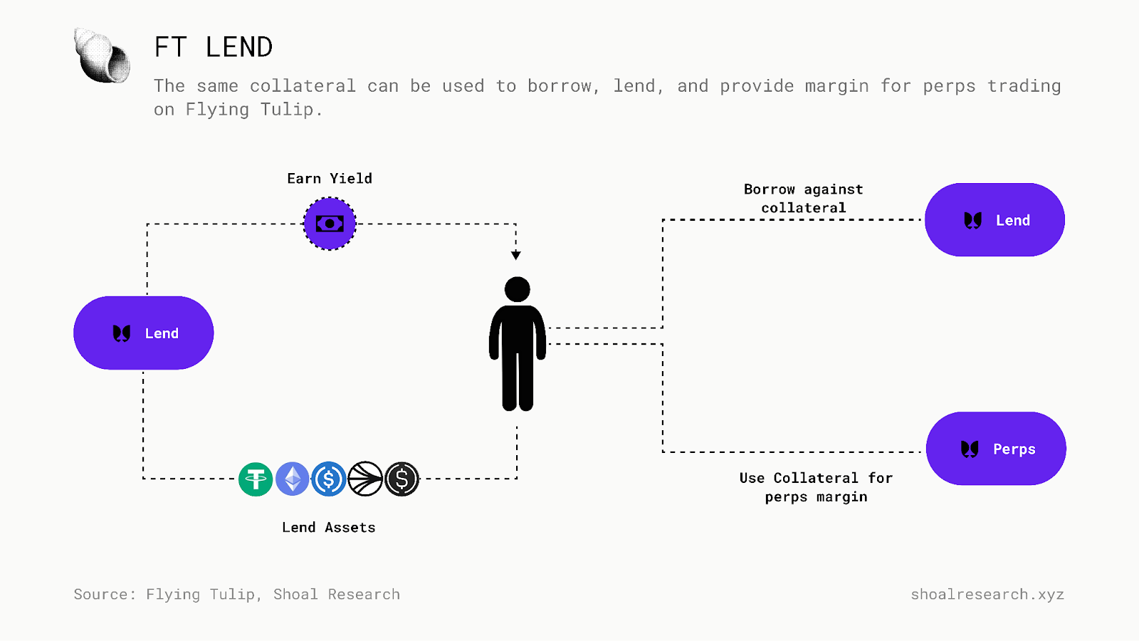 Flying Tulip 引入了 FT 借贷,这是一种直接集成到协议的统一保证金系统中的原生货币市场。它允许用户使用支持协议中交易、结算和衍生品头寸的相同抵押品来借入和借出资产。FT 借贷从头开始设计,可以在由流动性深度和波动性的实时市场数据提供支持的自适应框架内运行。
