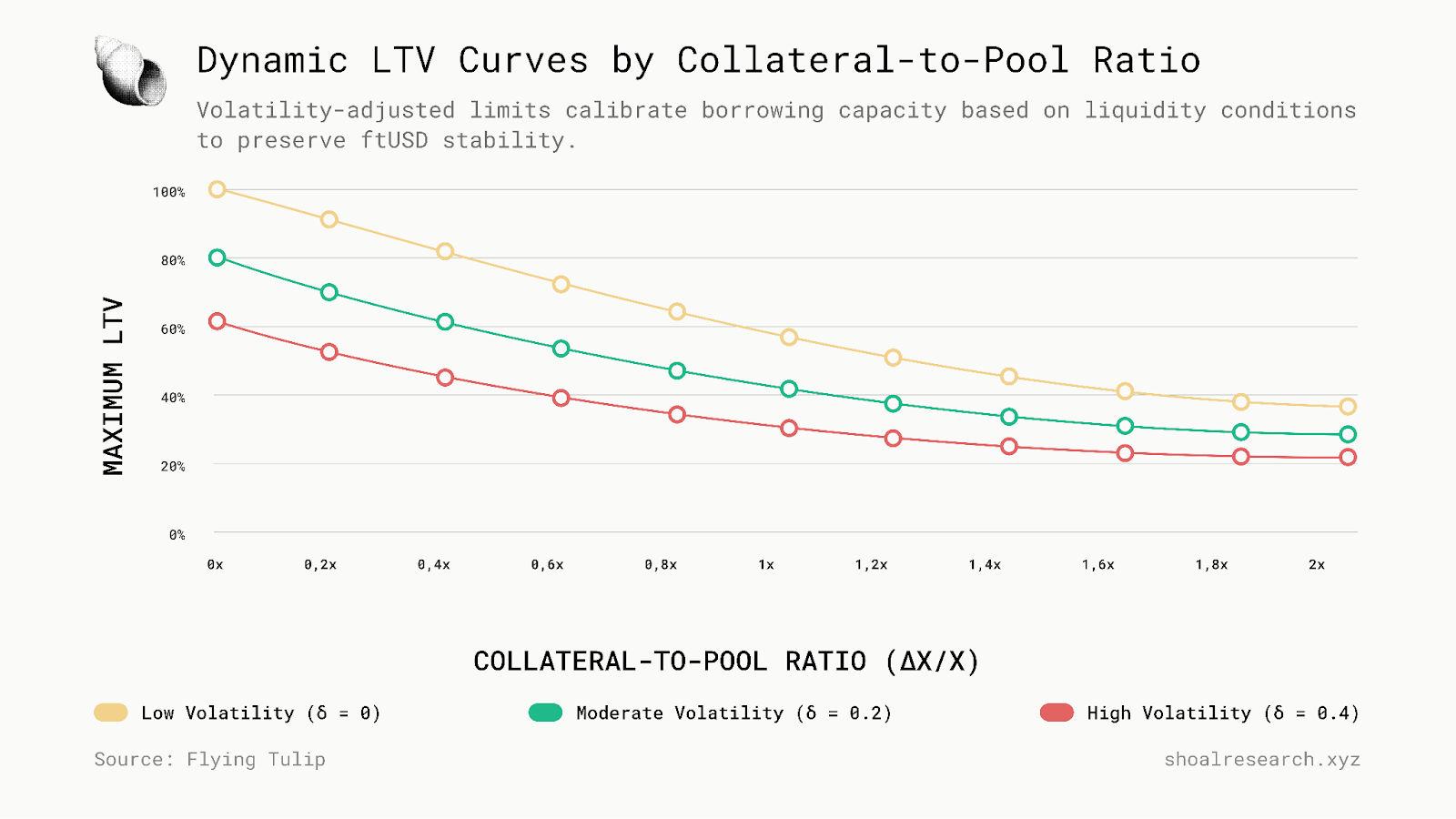 如上图所示,Flying Tulip 的协议研究表明,抵押品利用率会根据市场波动性和流动性深度进行调整。随着波动性上升或流动性变薄,允许的最大 LTV 会沿着可预测的曲线下降,从而允许杠杆随着市场稳定性的扩大和收缩,而不是保持固定。这种关系直接影响 FT 借贷如何实时校准借款能力和清算行为,从而确保整个协议中的资本分配具有响应性和风险意识。