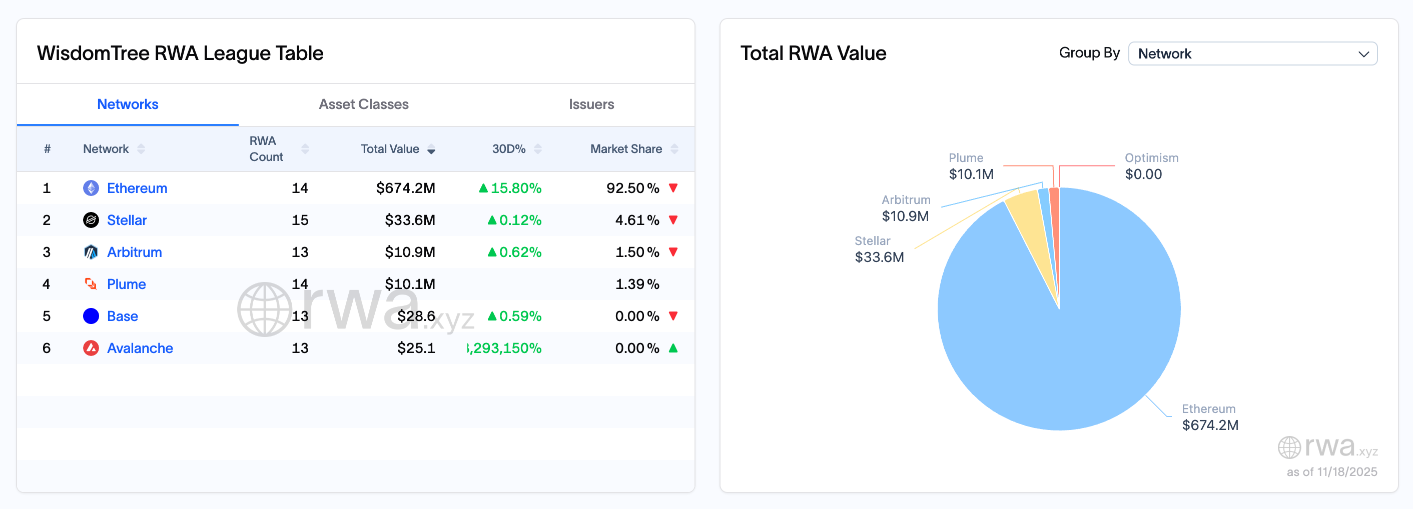 截至 2025 年 11 月,WisdomTree 已将其 Token 化基金部署在六个区块链上: