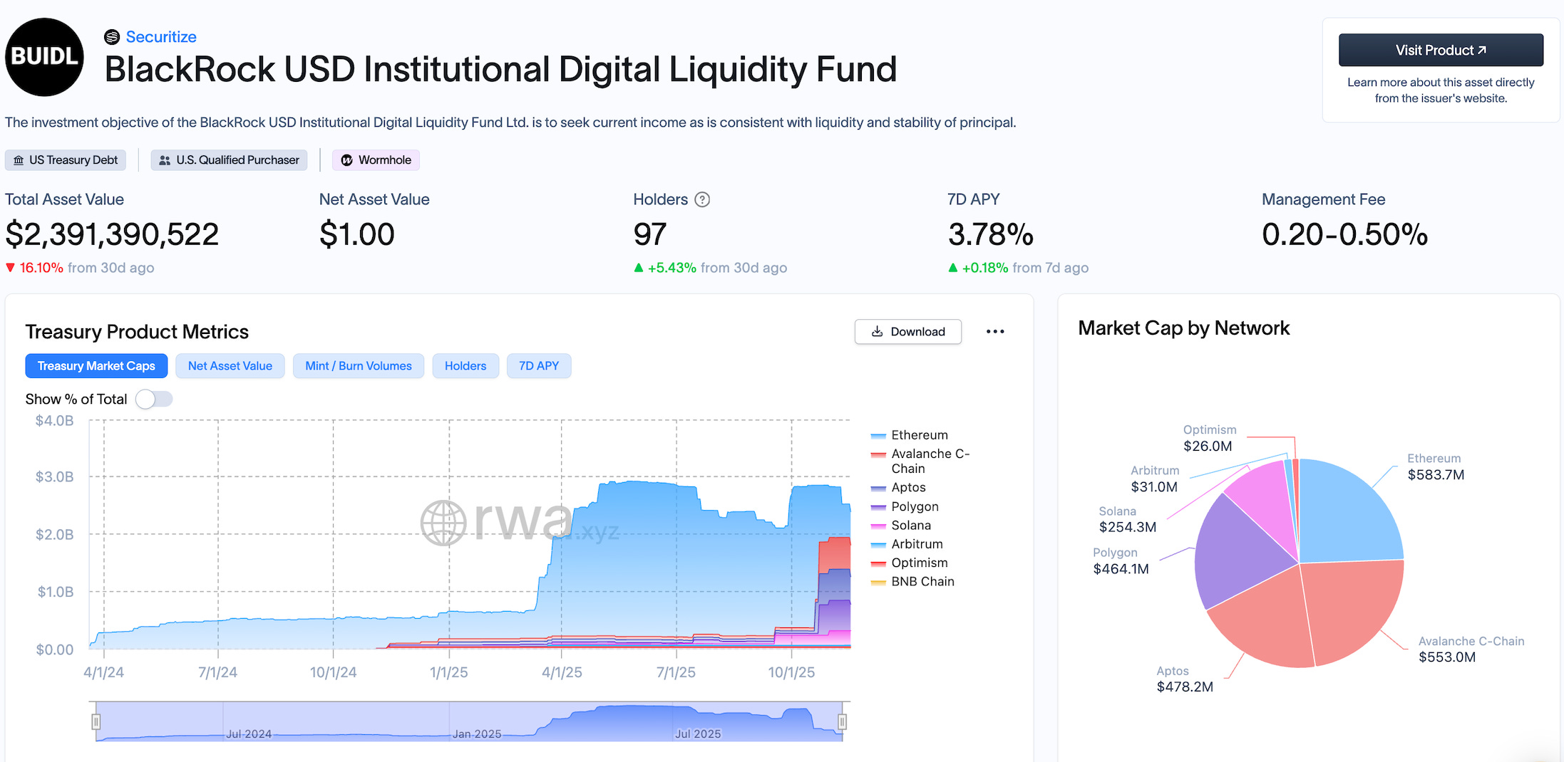 2025 年 7 月至 11 月期间发生了剧烈的重新平衡。截至 2025 年 11 月 15 日,BUIDL 的 25.2 亿美元几乎平均分配在四个主要链上: