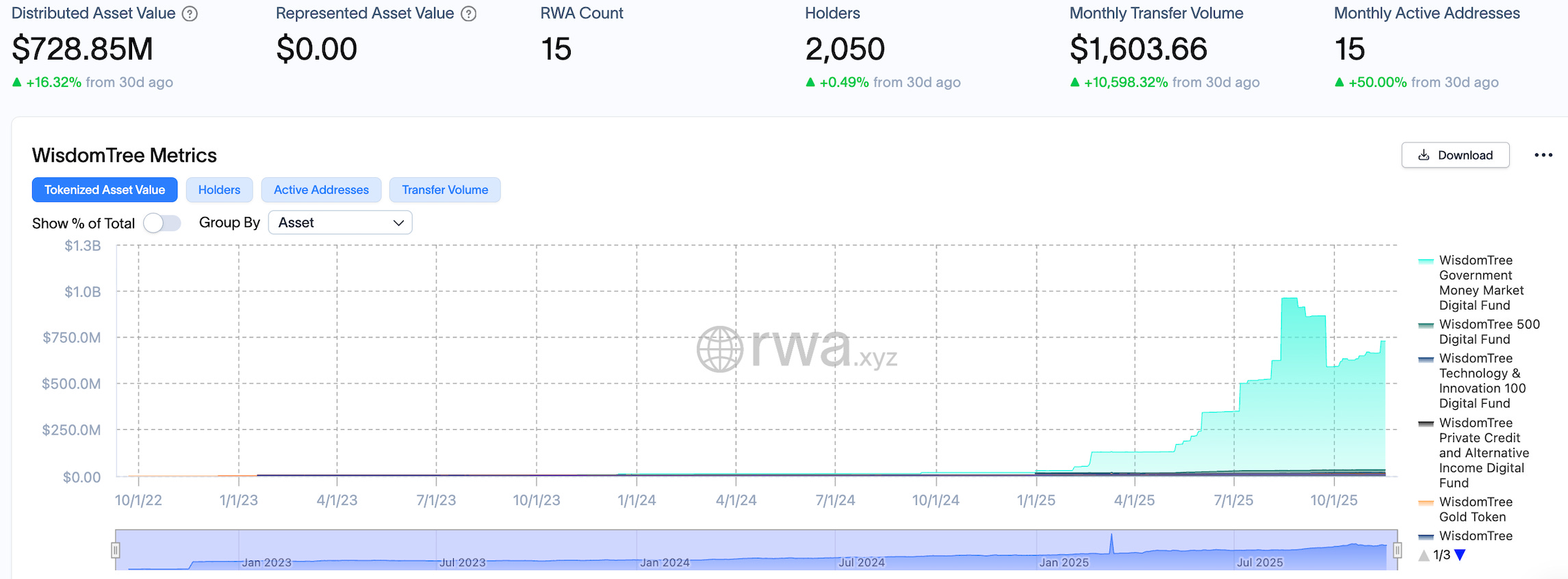 WisdomTree 于 2022 年 10 月推出 WTGOLD (WisdomTree Gold Token),率先推出了 Token 化资产,使其成为最早采用区块链技术的主要资产管理公司之一。该公司有条不紊地扩大了其产品范围,从 2022 年 10 月的 664,504 美元增长到 2025 年 11 月的 7.2884 亿美元,在三年内实现了惊人的 1,096 倍增长。