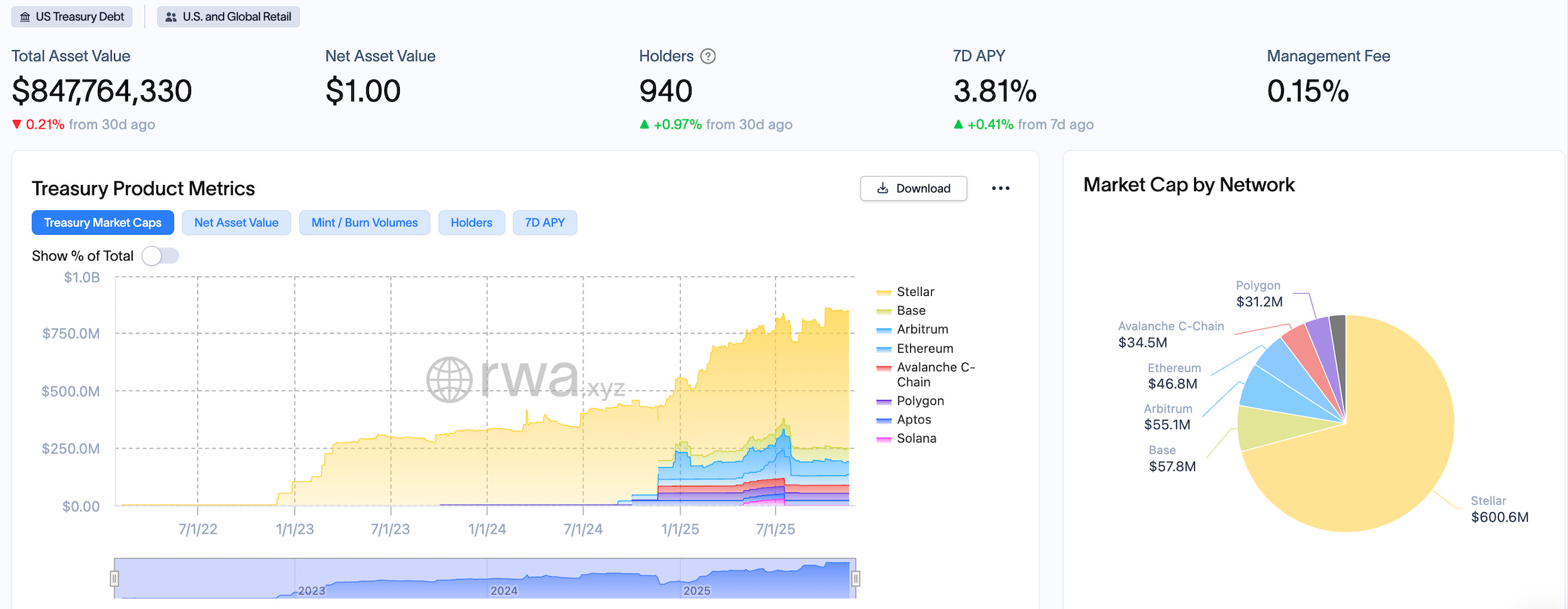 到 2025 年 11 月 16 日,BENJI 已增长至 10 条链上的 8.497 亿美元,显示出向 Stellar 的显着重新集中。