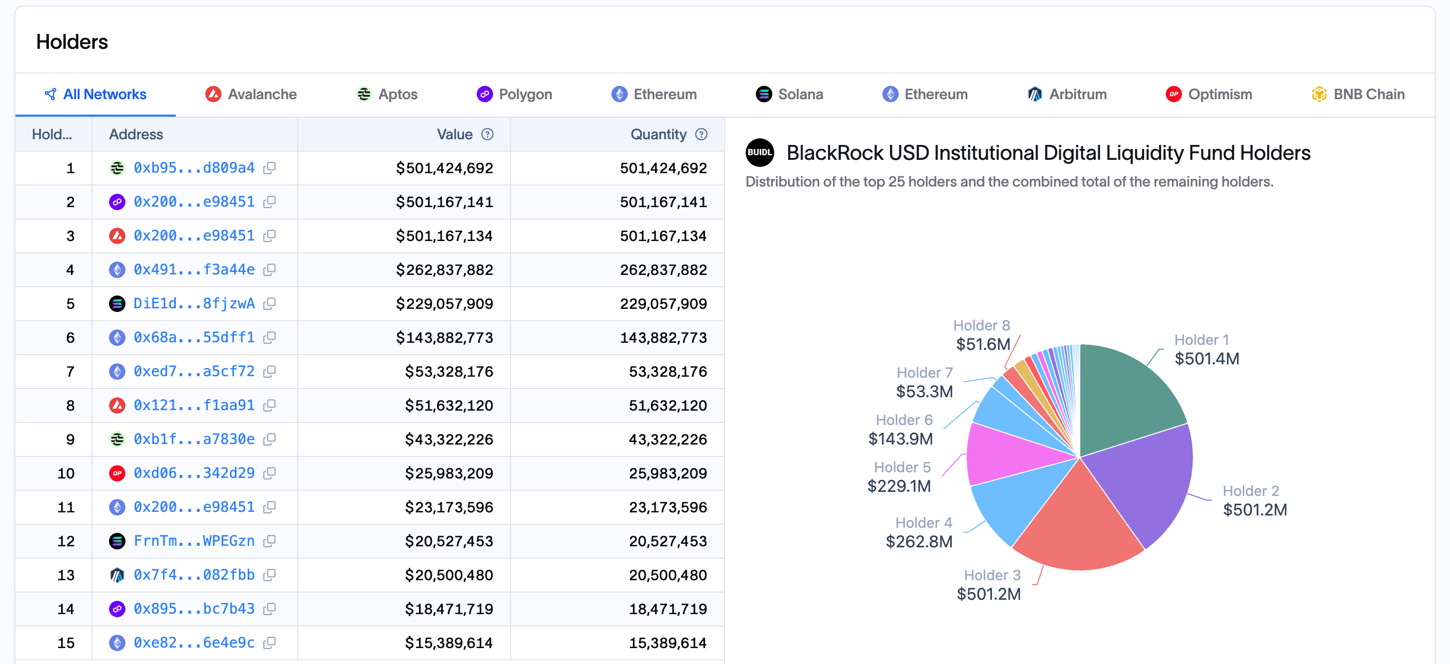 截至 2025 年 11 月,贝莱德的 BUIDL 基金共有 97 位持有者,所有权结构高度集中。前五大持有者控制着该基金 25 亿美元总资产中约 20 亿美元:
