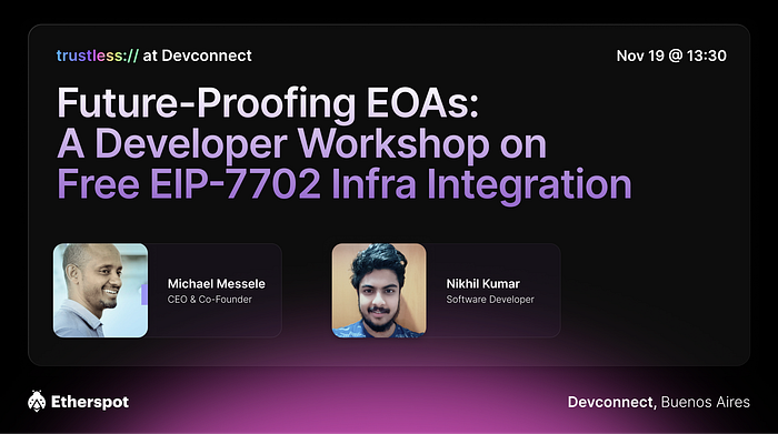 Etherspot 宣布 它将在布宜诺斯艾利斯 Devconnect 期间的 Trustless 会议上举办一个关于集成免费 EIP-7702 基础设施的实践开发者会议。