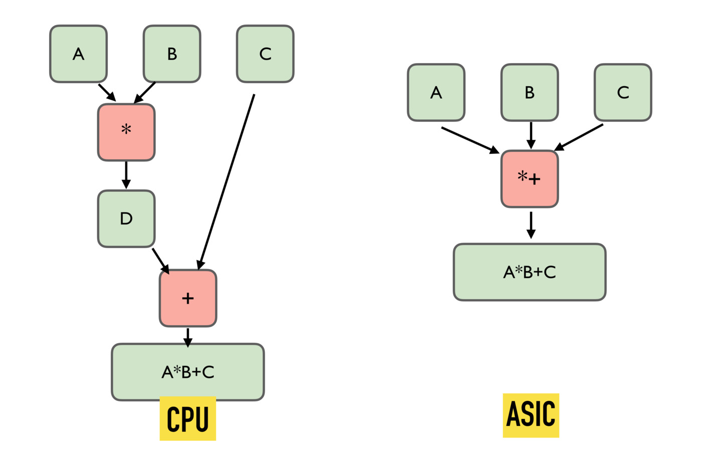CPU 去运算一个数学问题是通过编程思路来解决的。CPU 面向的是通用的计算任务,所以硬件层面上只能去完成加法或者乘法这样的基础运算。所以要完成一个复杂运算,例如 A*B + C ,就需要多个运算操作,要耗时多个时钟周期才能完成。但是如果开发一种集成电路,使得可以在硬件层面上直接完成 A*B + C 的操作,那么执行这个运算就只需要一个计算操作,消耗一个时钟周期了。这样的集成电路的特点是不再具有通用型,但是完成特定任务是效率却奇高,这就是所谓的 ASIC 了。SHA256 运算比上面的先乘后加操作要复杂,但是道理是一样的。