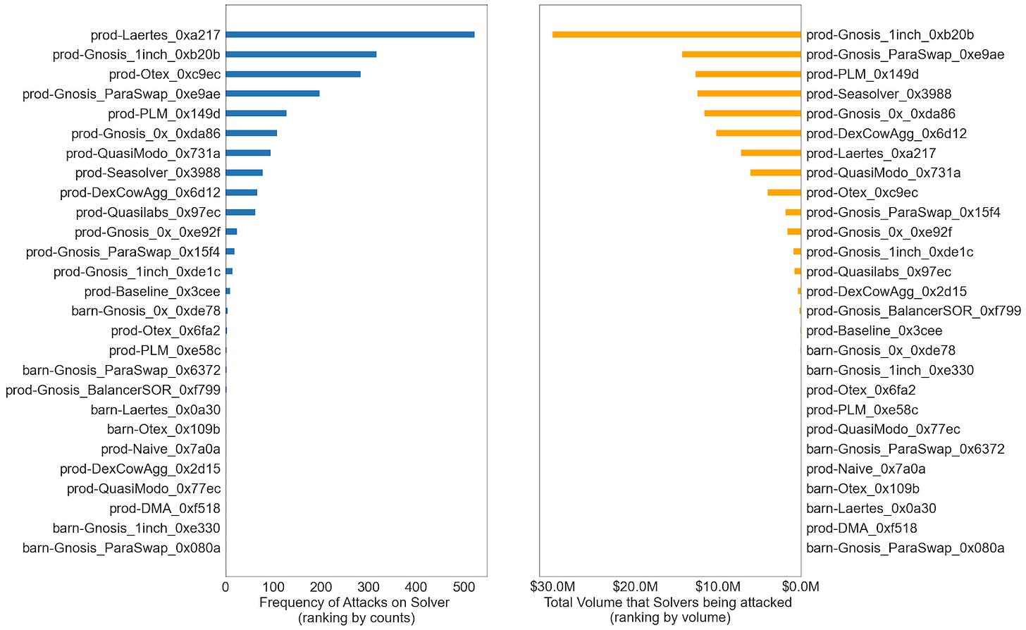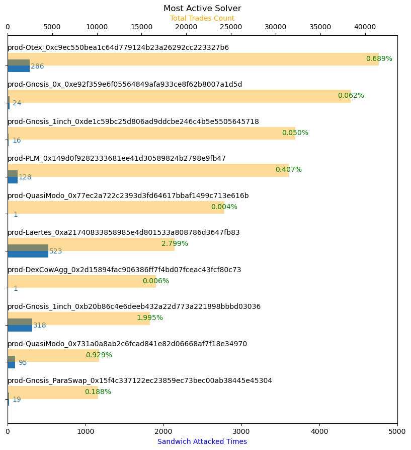 以下是三明治攻击针对最多的前 10 个求解器列表。它们根据其遭受的攻击次数(左)和被攻击的总交易量(右)进行排名。虽然他们攻击 prod-Laertes 的次数最多,但被攻击的总交易量仅排名第 7。被攻击交易量最高的求解器是 prod-Gnosis,被攻击的总交易量为 3000 万美元。