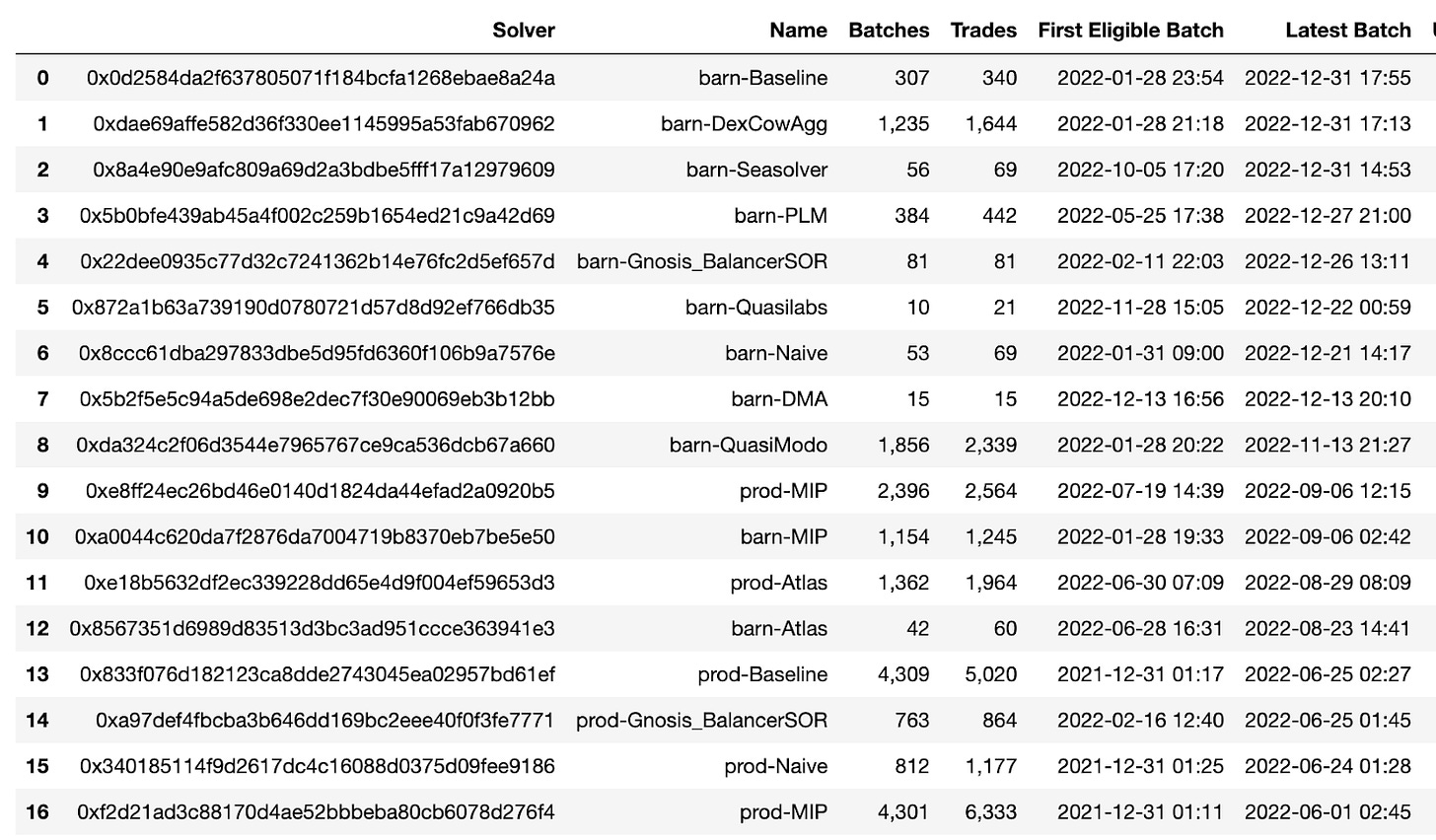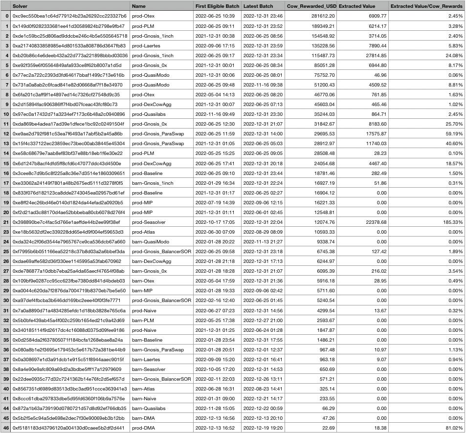 以下是没有遭受任何 MEV 攻击的求解器地址列表。它包括它们的批次、交易以及首次和最后一次批处理的日期。