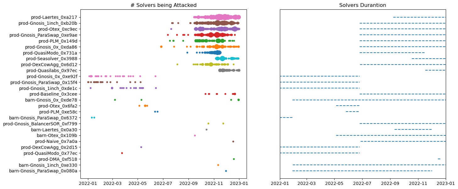 图表中的数据点表示每个攻击者每天针对 CoW Swap 交易的次数,点的大小表示攻击频率。点越大,表示相应攻击者在特定日期的攻击次数越多。右侧的图表显示了 2022 年每个攻击者的攻击持续时间,从他们的第一次攻击日期到他们当年的最后一次攻击日期。图表上的水平线表示此信息。