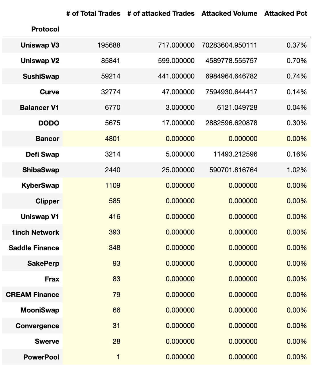 我们对被利用最多的流动性池进行了排名,发现只有 Uniswap 和 Sushiswap 池受到攻击。结果按攻击发生的次数进行排名。值得注意的是,Uniswap v3 USDC/WETH 池是被攻击的所有池中交易量最高的受害者。