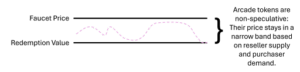 考虑一下这些参数对市场的影响:当你知道你可以随时以 25 美分的价格从水龙头(或自动售货机)购买相同的代币时,你会以一美元的价格从投机者那里购买 25 美分的代币吗?不可能——这是没有道理的!(或者美分,就此而言。)搬到不同城镇的人可能会站在街机游戏厅前,试图以每个 22 美分的价格出售他们剩余的 25 美分代币,但某人以超过 25 美分的价格购买它们是没有意义的。因此,虽然有些人可能会选择以折扣价出售他们的街机代币(例如,如果他们永远离开生态系统),但价格在任何给定时间点都应保持相对稳定。