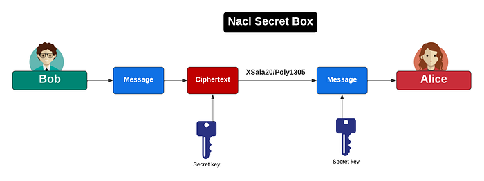 使用 Secret Box,Bob 和 Alice 共享一个密钥,该密钥用于加密数据,然后解密数据。这使用 XSala20/Poly1305 进行对称密钥加密(并使用 192 位 nonce):