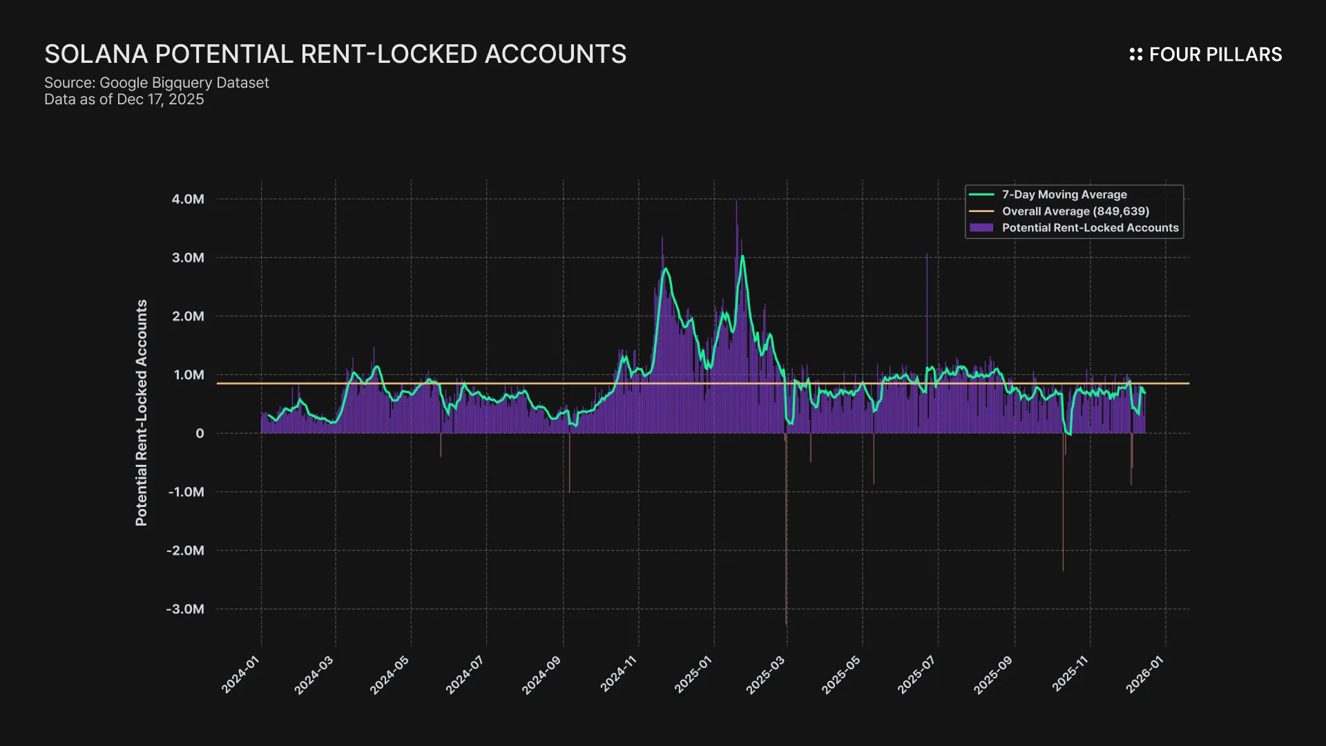 Solana 使用一种租金模型,其中账户在创建时存入一笔可退还的储备金,以支付数据存储成本。即使在用户出售其 token 之后,token 余额为零的账户也不会自动关闭,这导致累积了大约 6.07 亿个可能被遗弃的账户。锁定在真正被遗弃的“僵尸 ATA”中的流动性估计至少为 110,000 SOL,从而形成了一个巨大的租金回收市场。
