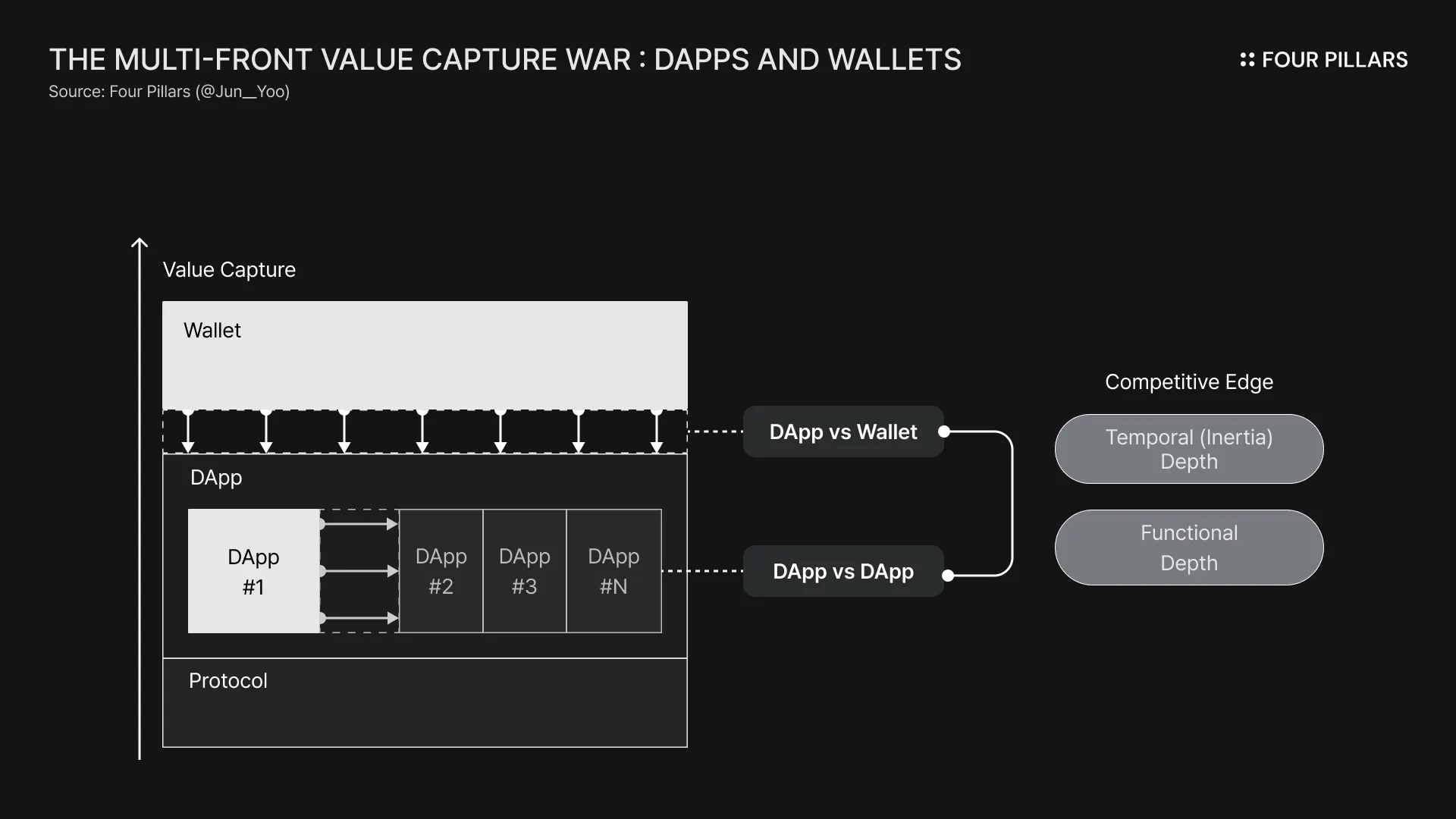 区块链中的价值捕获叙事已经从协议转移到应用程序,最近又转移到钱包,钱包已经吸收了诸如 swap 和 bridge 之类的功能,现在直接位于用户接触点上。这种演变甚至产生了 Fat Wallet 理论,该理论认为钱包将主导生态系统的价值捕获。但是,DApp 仍然可以建立钱包不易突破的防御,利用时间深度(temporal depth),即植根于用户体验的惯性,以及功能深度(functional depth),即切入市场本质的功能。这两种形式的深度可以为 DApp 提供持久的、独立的竞争优势。
