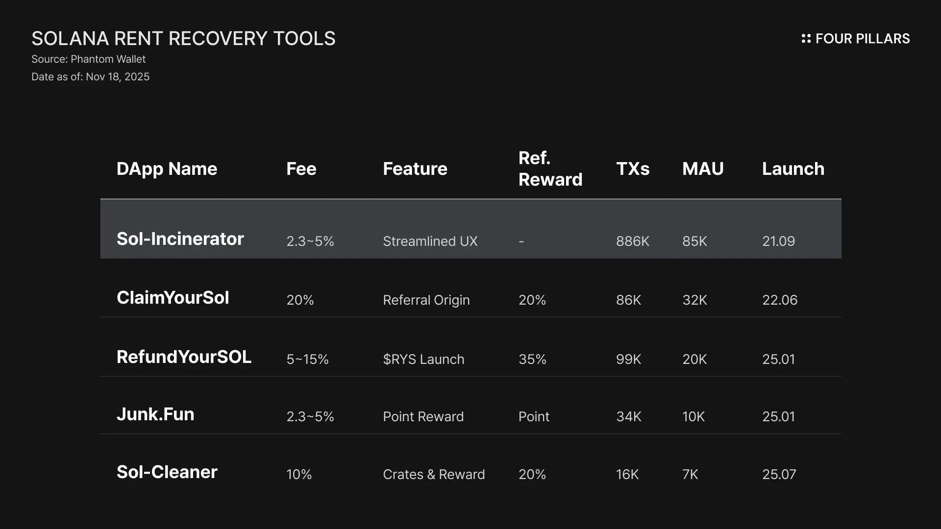 Sol Incinerator 通过提供一种实用程序来捕获这个市场,该实用程序可以查找用户没有意识到他们已经锁定的租金并将其返还。截至 2025 年 11 月,它总共返还了超过 470,000 SOL,并记录了接近 80% 的重复使用率,从而确立了明确的类别领导地位。这表明,即使后来的进入者引入了额外的激励措施,例如推荐或游戏化,用户仍然选择了专注于核心结果(资产回收)的直观工作流程,以及已经在市场上验证过的信任。