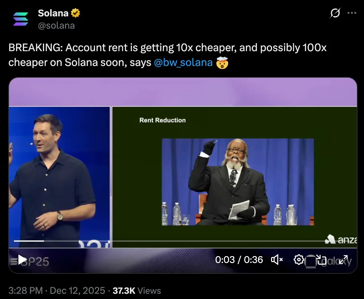 在 2025 年 12 月 12 日举行的 Solana Breakpoint 2025 大会上,Solana 开发公司 Anza 认为“租金太高了”,并宣布了一项大幅降低链上存储成本的计划。该路线图旨在通过将租金降低到当前水平的十分之一,甚至可能低至百分之一,让项目可以构建大型账户而不会造成沉重负担。