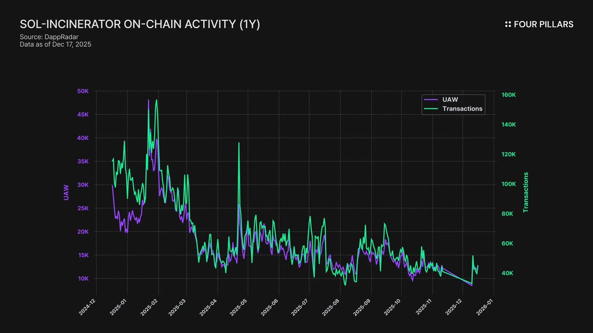 从 2024 年末的数据来看,在推出三年后,Sol Incinerator 的每日活跃钱包 (UAW) 达到约 48,000 个,因为 meme 币活动推动了对完全清算后遗留下来的账户进行清理的需求激增。随着狂热降温,该指标下降,但值得注意的是,每天仍有超过 10,000 个独立钱包地址在使用该应用程序,从而保持了有意义的交易量。租金回收已成为 Solana 用户资产管理的常规操作,而不是季节性时尚,同时也具有通过减少不必要的账户和清理网络状态的公益性质。个人收回少量金额,生态系统减少状态膨胀,服务赚取费用。这种结构直接转化为数据中的显著性能。