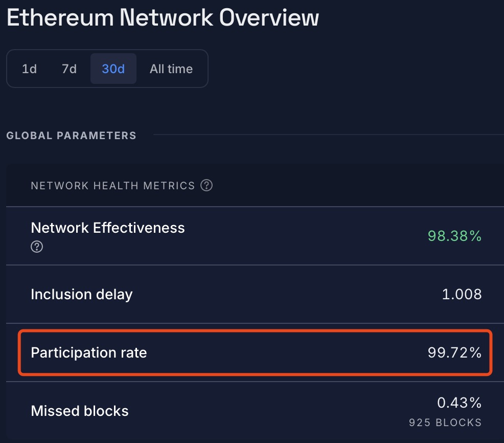 例如,以太坊和 Solana 在实践中都具有非常高的参与度(以太坊参与度约为 99%+,Solana 投票成功率约为 99%+,来自Rated),远好于最坏情况的假设:
