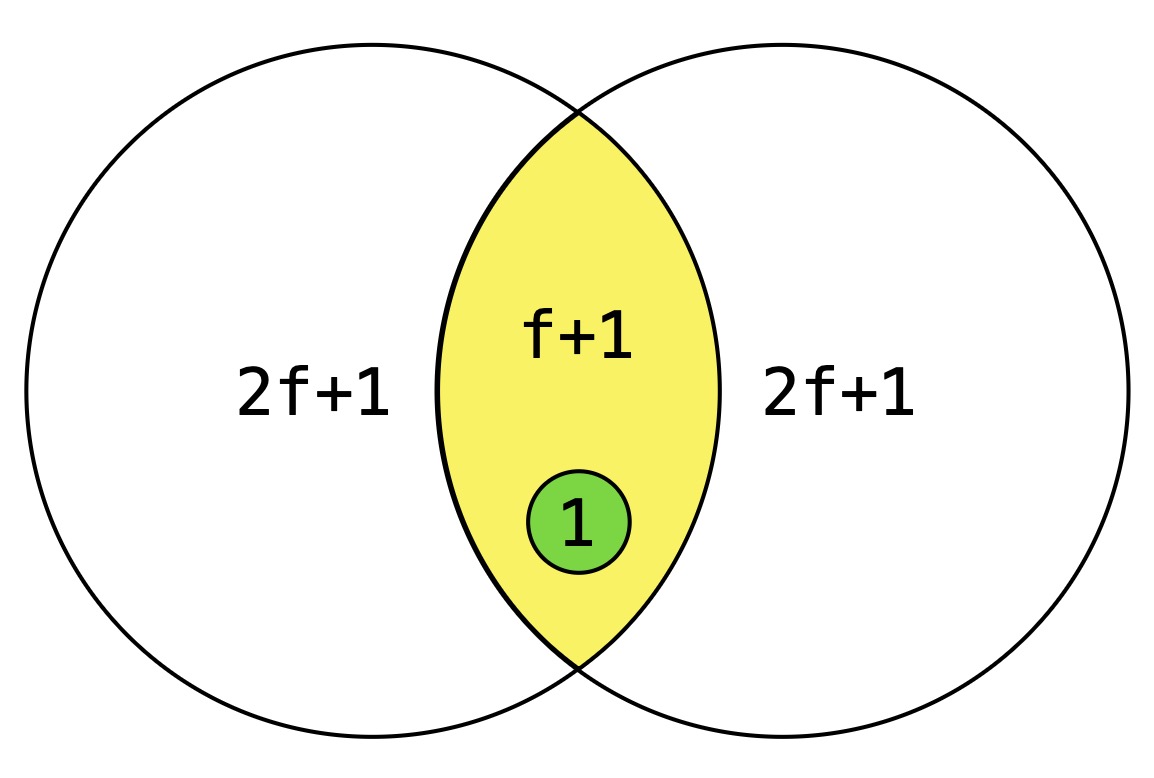 最小的整数选择是 n = 3f + 1。 在这种经典设置中,选择 x = 2f + 1 满足双方: