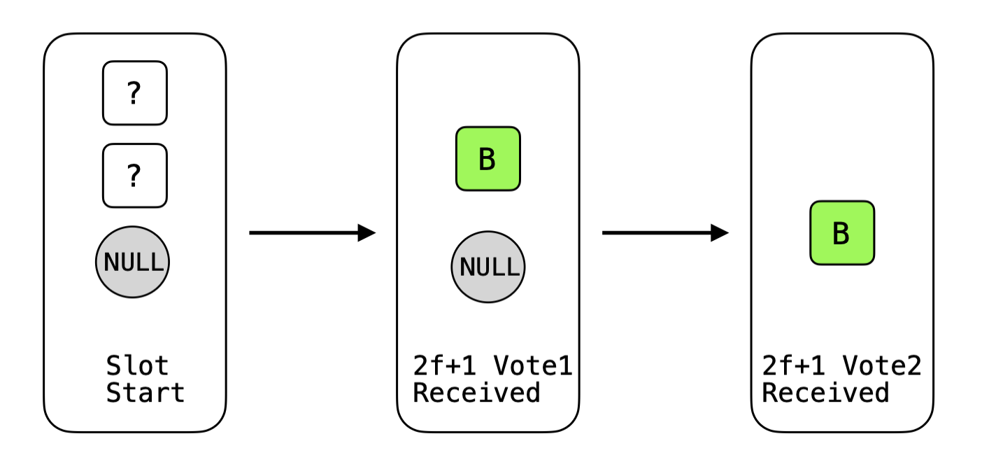 vote1 之前,验证器无法确定将最终确定哪个区块(如果有)。B 的 2f + 1 个 vote1 之后,插槽的结果为“B 或空”(没有冲突的区块也可以收集 2f + 1)。B 的 2f + 1 个 vote2 之后,B 无法在以后的插槽中跳过,因此可以安全地最终确定。 所有诚实的验证器最终也会了解到这一点并最终确定 B。
