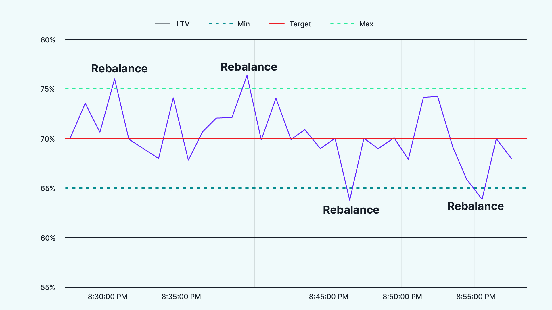 贷款价值(LTV)重新平衡是一种智能管理你的抵押品缓冲的机制。该协议不会让大量资本闲置以避免清算,而是谨慎地利用你的全部贷款潜力来产生回报,同时保持安全边际,从而使你的资本为你更努力地工作。