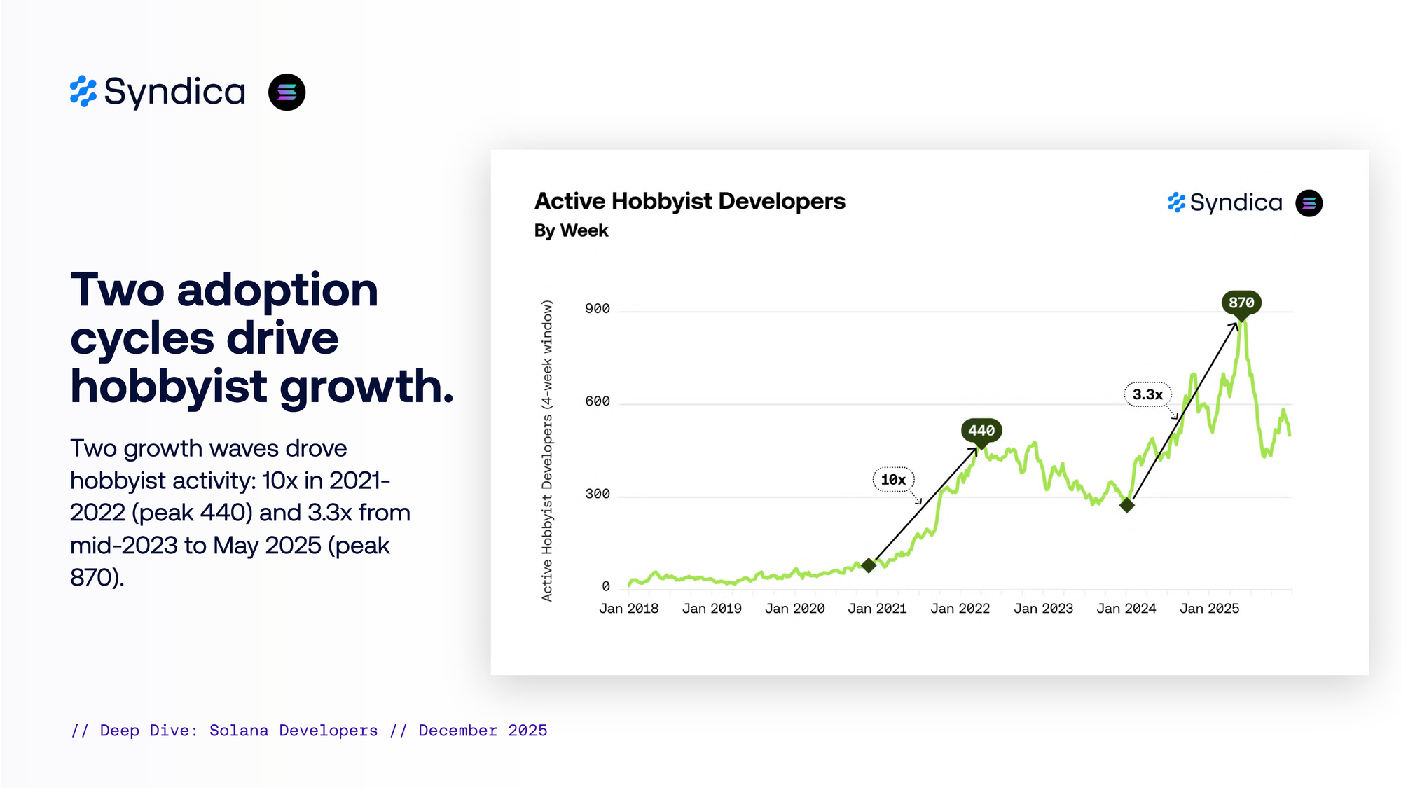 两波增长浪潮推动了业余爱好者的活动:2021-2022 年增长了 10 倍(峰值 440),从 2023 年年中到 2025 年 5 月增长了 3.3 倍(峰值 870)。