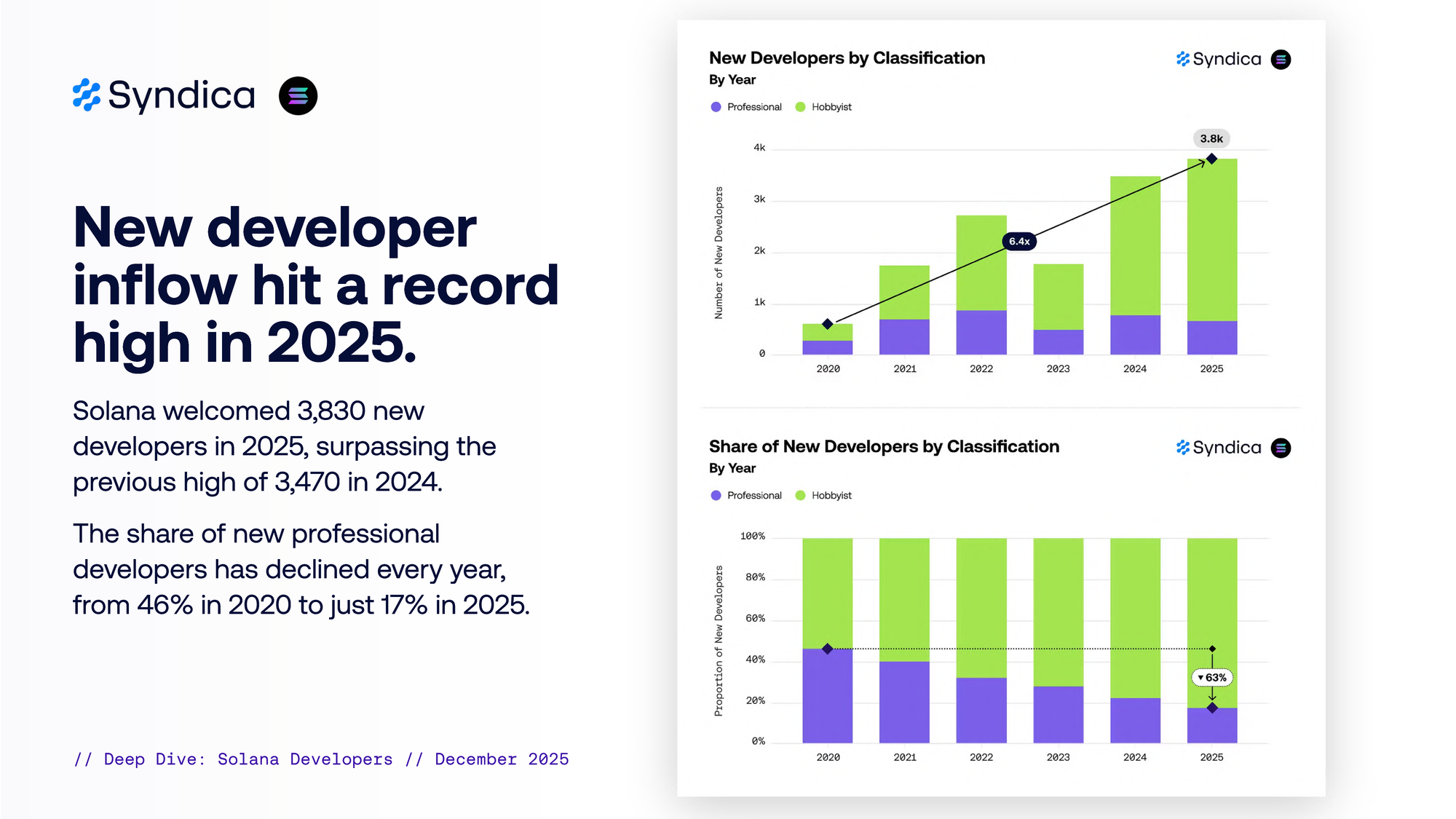 在 2023 年下降之后,专业开发者和业余开发者都在 2025 年达到了新的高点。专业开发者增长了近 7 倍(从 280 人到 1,900 人),而业余开发者增长了 12 倍(从 350 人到 4,100 人)。