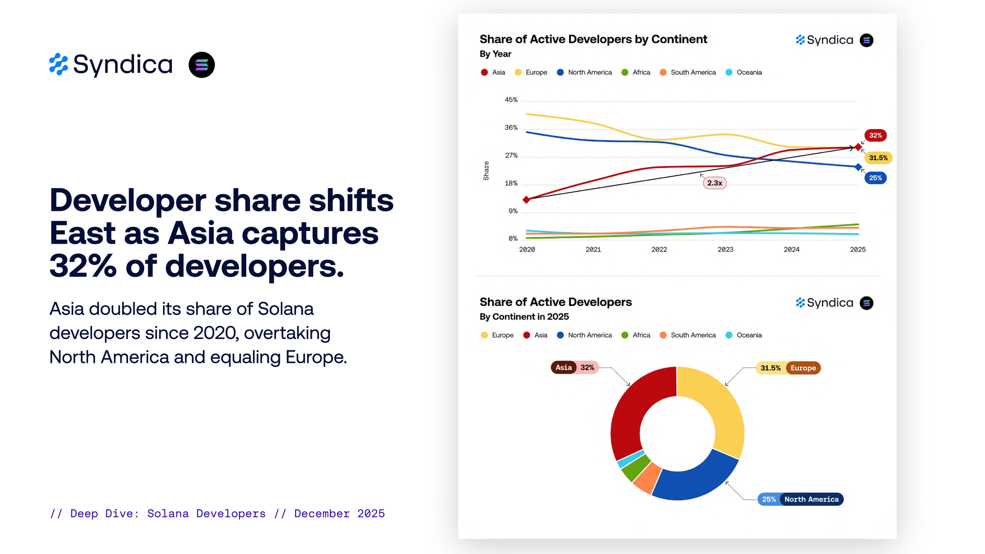自 2020 年以来,亚洲在 Solana 开发者中的份额翻了一番,超过了北美,与欧洲持平。