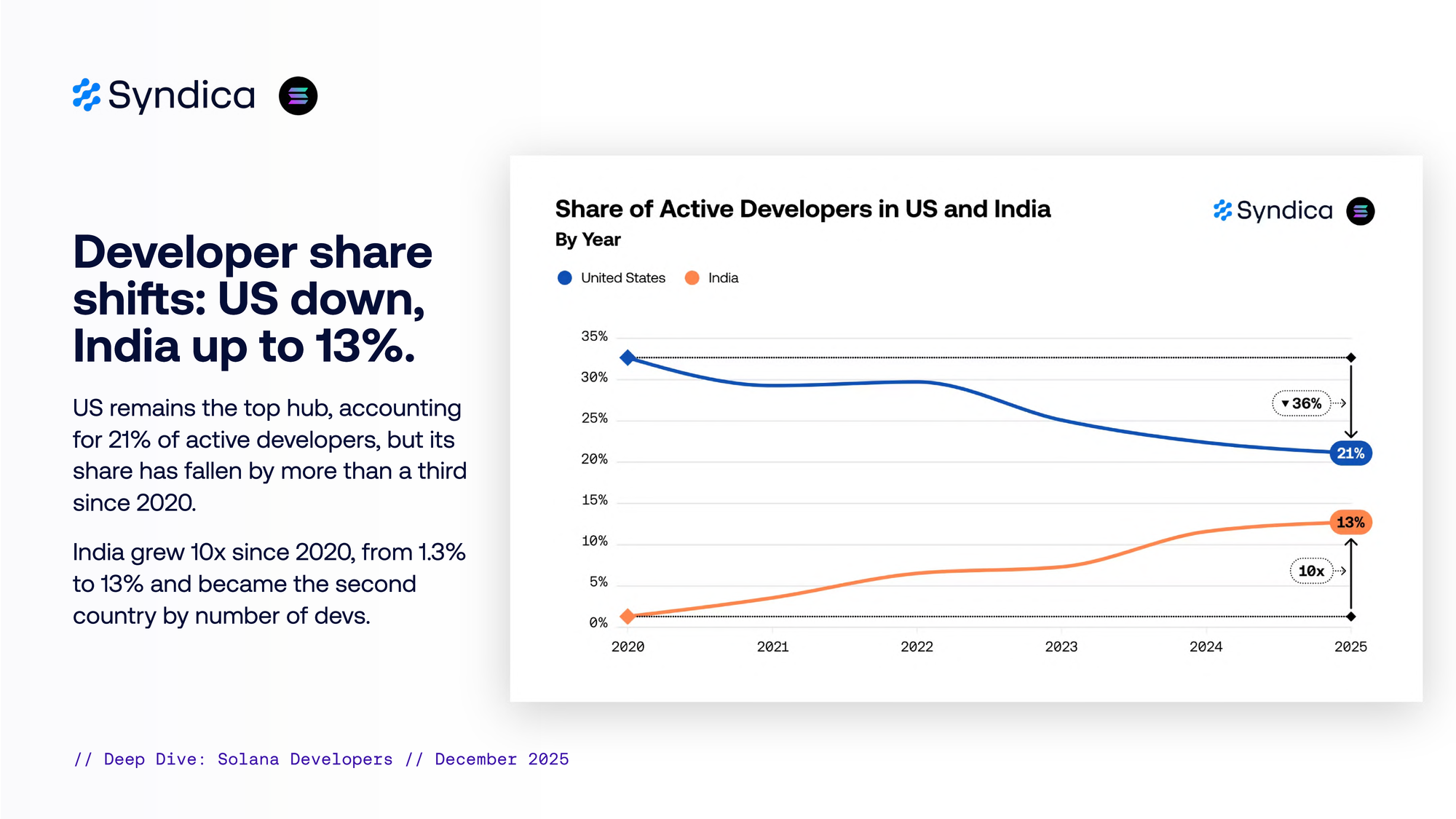 美国占 2025 年活跃 Solana 开发者的 21%,其次是印度,占 13%。