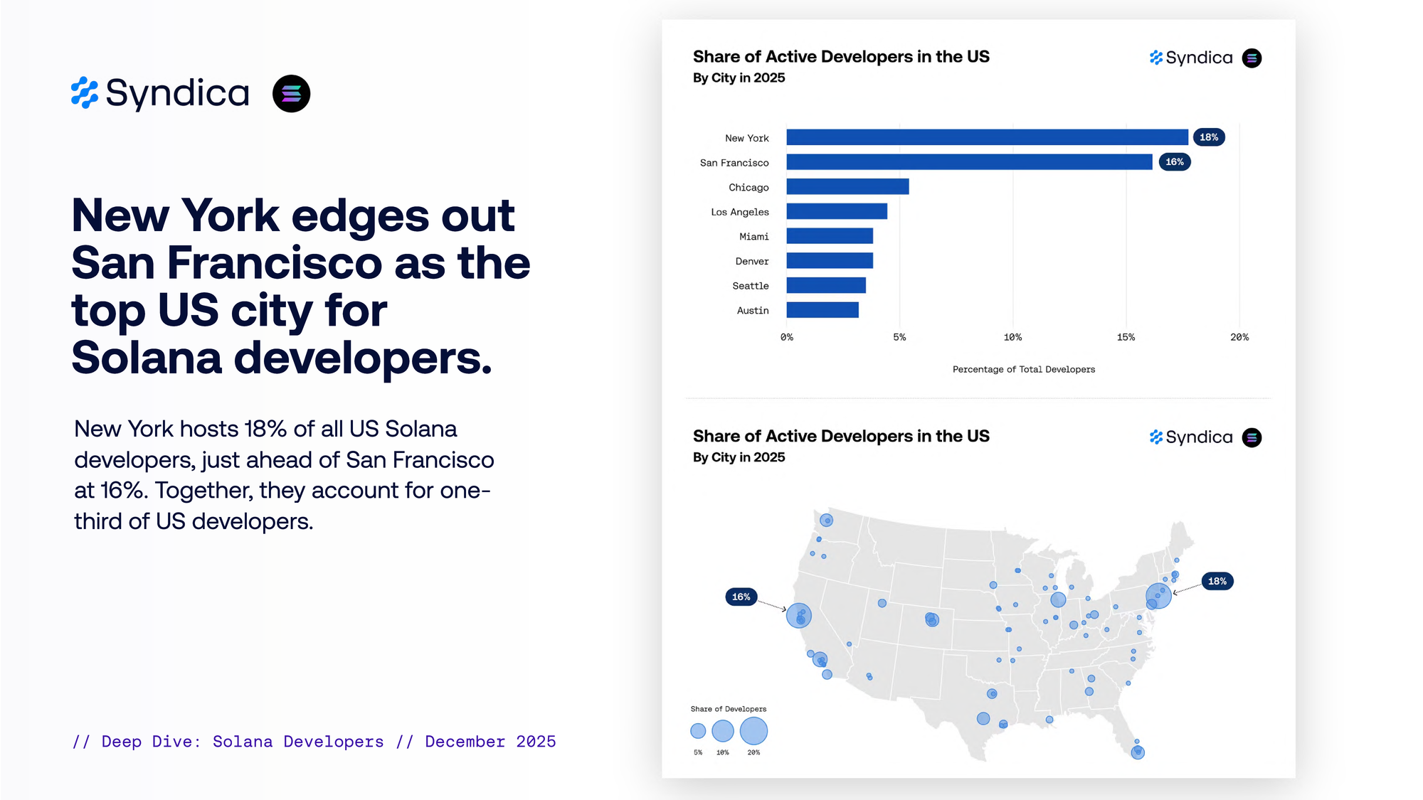 纽约拥有美国 Solana 开发者的 18%,略高于旧金山的 16%。他们共同占美国开发者的三分之一。