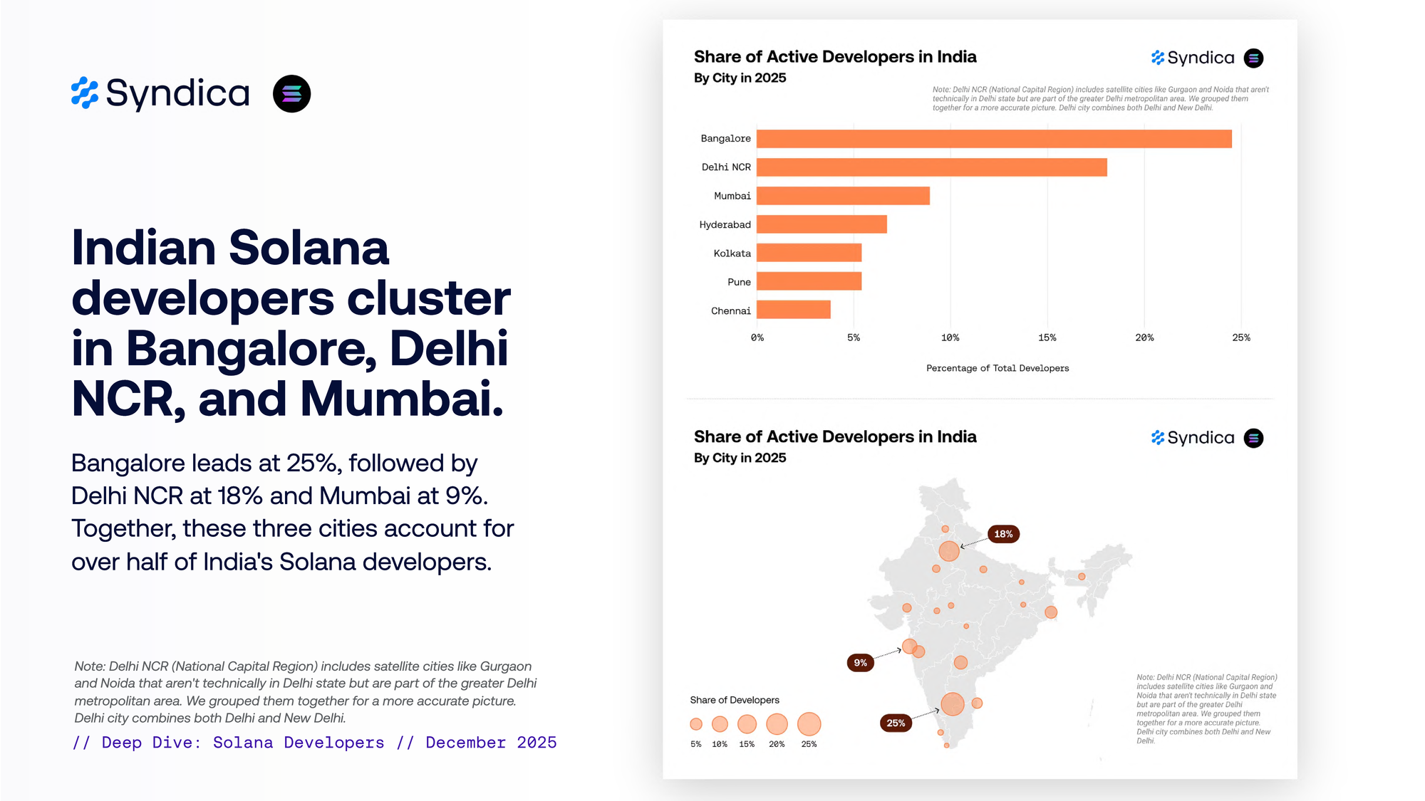 班加罗尔以 23% 领先,其次是德里 NCR,占 17%,孟买占 14%。这三个城市共同占印度 Solana 开发者的一半以上。