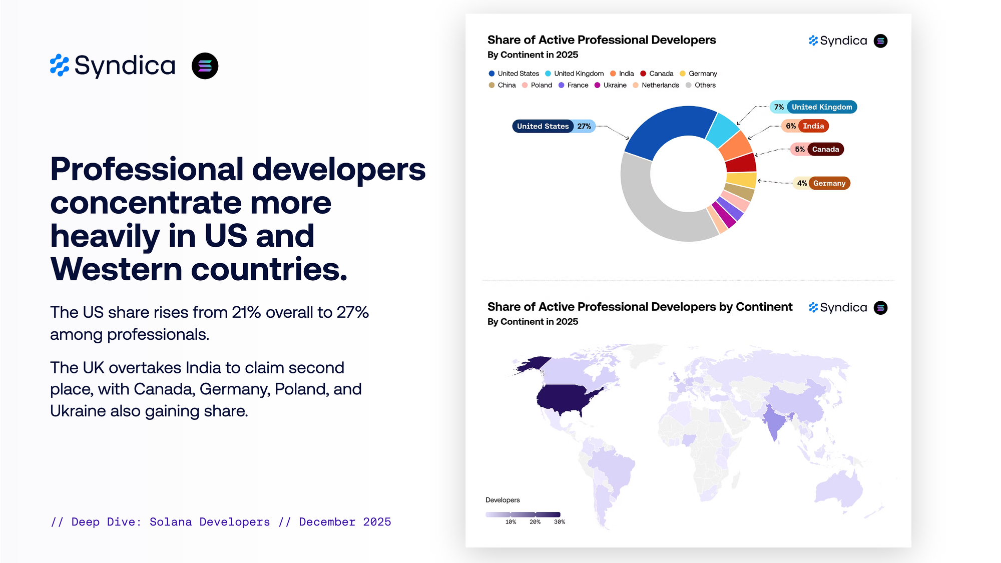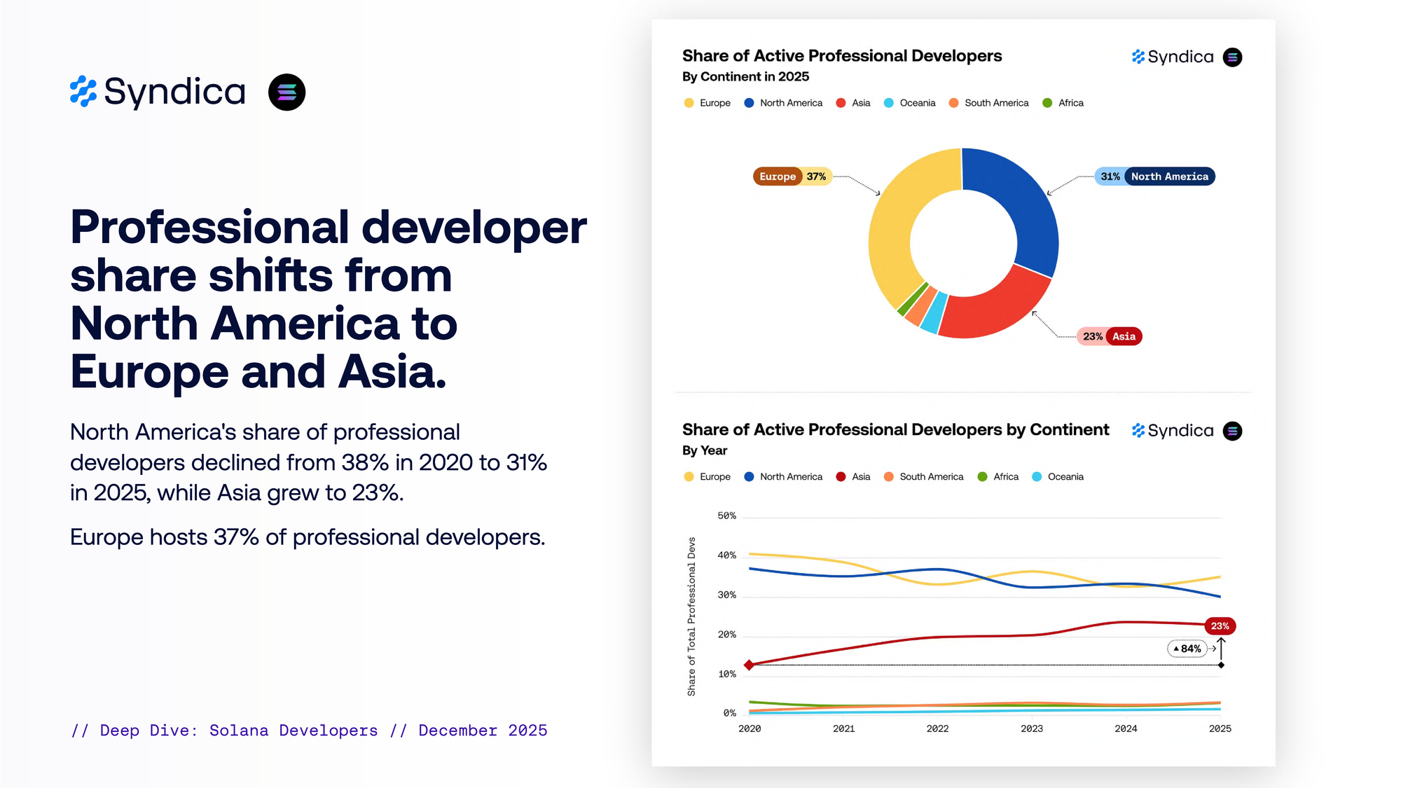 北美在专业开发者中的份额从 2020 年的 48% 下降到 2025 年的 33%,而亚洲增长到 21%。