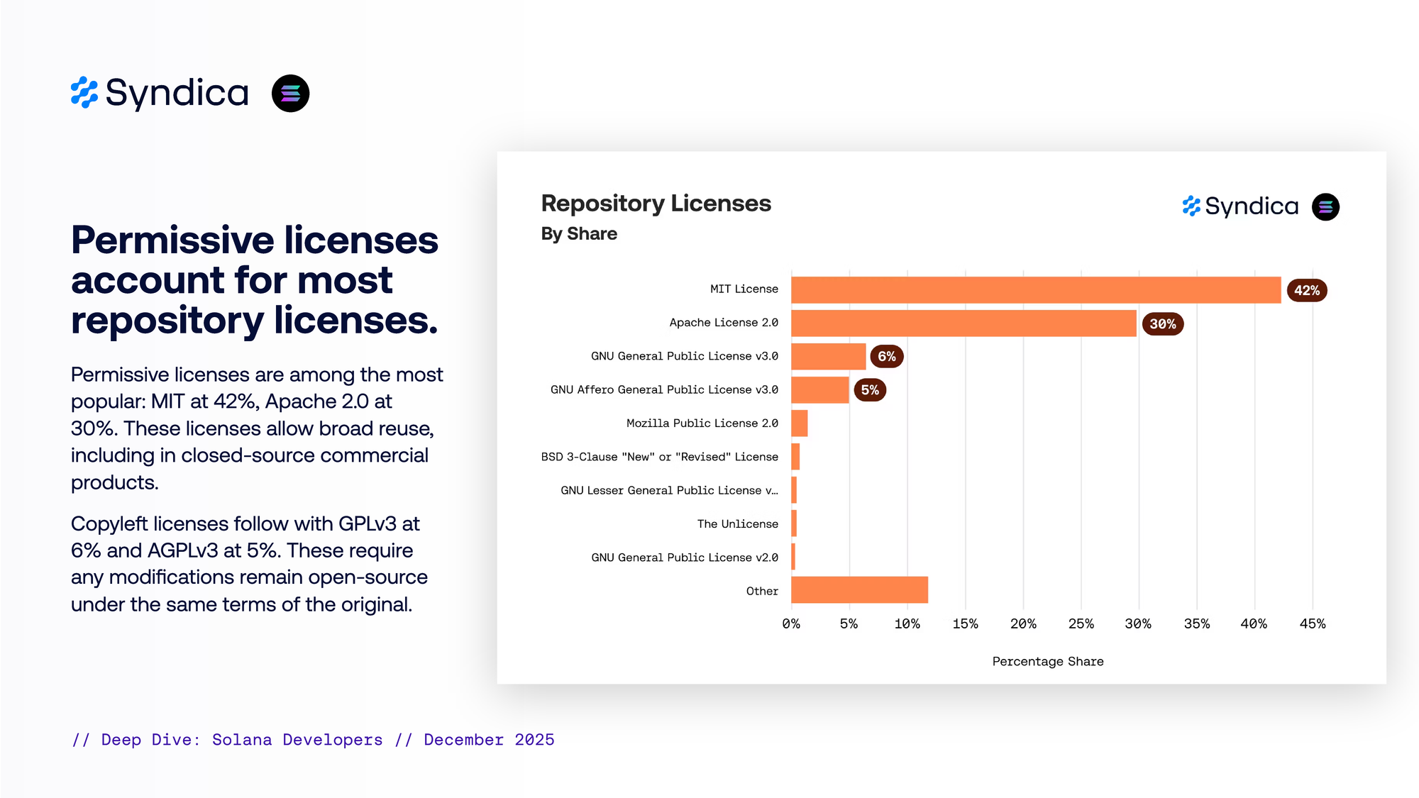 宽松许可证是最受欢迎的许可证之一:MIT 占 42%,Apache 2.0 占 30%。这些许可证允许广泛的重用,包括在闭源商业产品中。