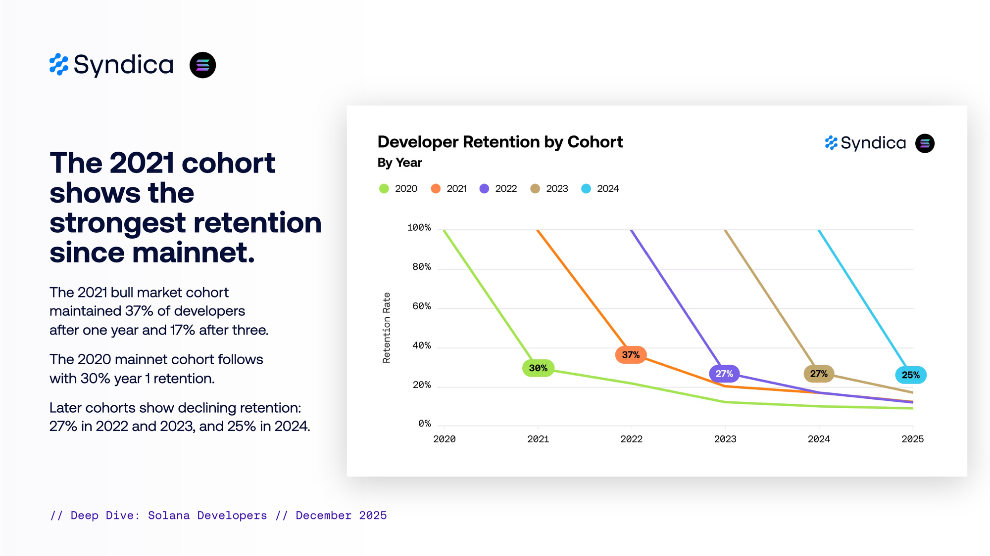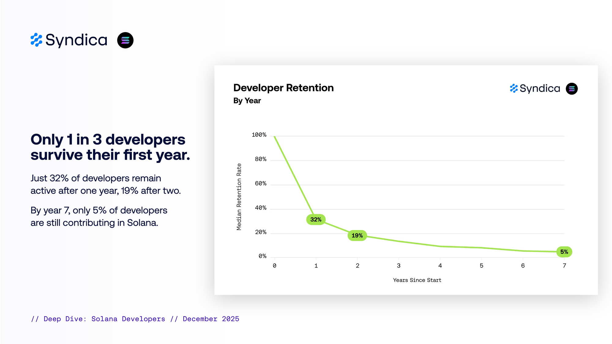 只有 32% 的开发者在一年后仍保持活跃,两年后为 19%。到第 7 年,只有 5% 的开发者仍在 Solana 中贡献。