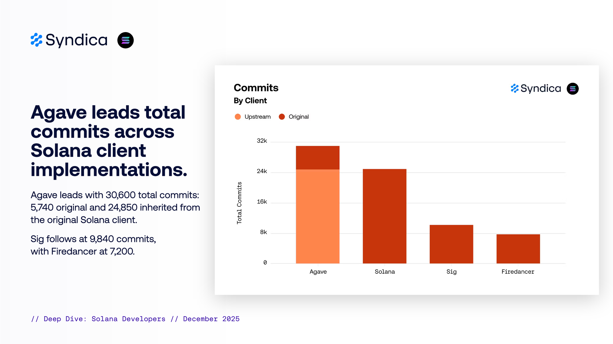 Agave 以 30,600 次总提交次数领先:5,740 次原始提交和 24,850 次从原始 Solana 客户端继承的提交。