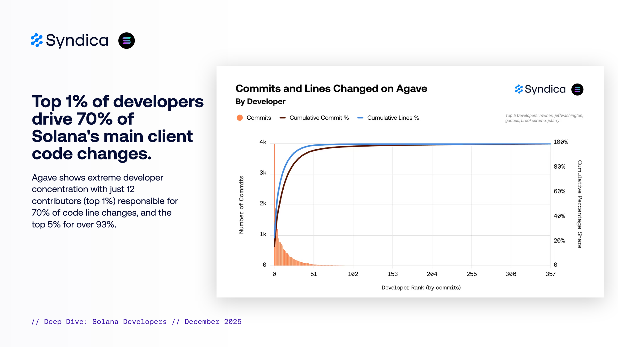 Agave 显示出极端的开发者集中度,只有 12 位贡献者(前 1%)负责 70% 的代码行更改,前 5% 的贡献者负责超过 93%。